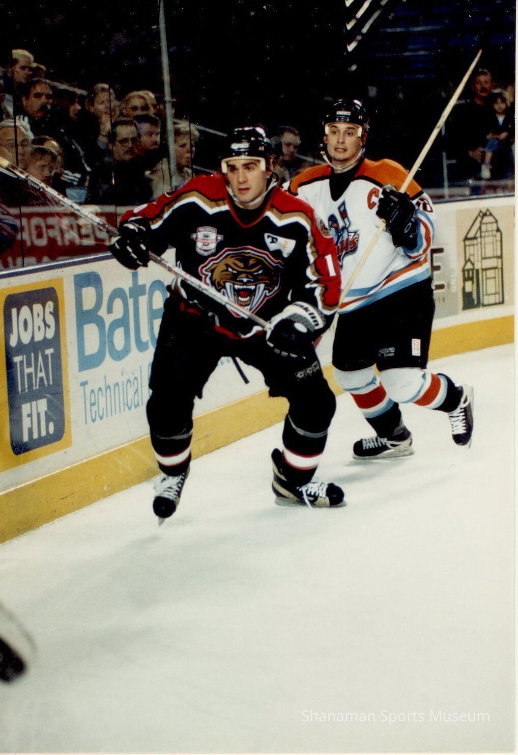 Cory Morgan chases down the puck during a game in the West Coast Hockey League 1999-2000 season at the Tacoma Dome. The Sabercats were a professional minor league hockey team that began playing in the 1997-98 season. Tacoma won the regular-season Northern Division title and reached the league finals in its first season. The Sabercats lost to the defending champion San Diego Gulls in the league’s first Taylor Cup. The following season, the Sabercats returned to the playoffs after winning the Northern Division title again and this time defeated the Gulls in the Cup finals. It would be the only league championship for the franchise, which folded after the 2001-02 season. The Sabercats made the playoffs all five seasons winning three division championships as well.