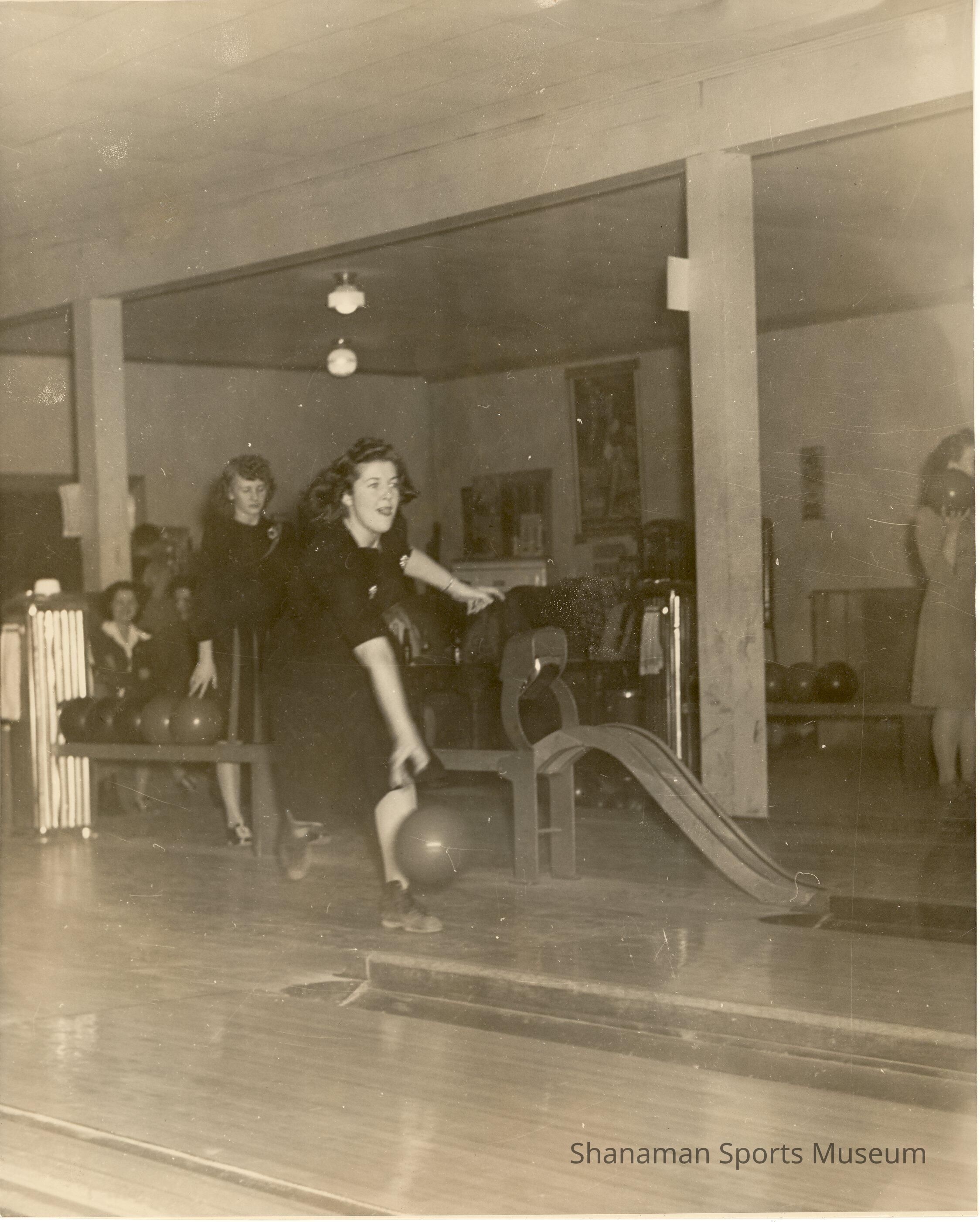 In the late 1940s, Peggy Ruehle lets loose with shot bowling wearing a dark dress. Ruehle and her husband, Bill Ruehle, were avid bowlers in Tacoma, where bowling has been popular for a long time. The Chalet Bowl in the Proctor District in Tacoma dates back to the early 1940s and is the oldest operating bowling alley in the state.