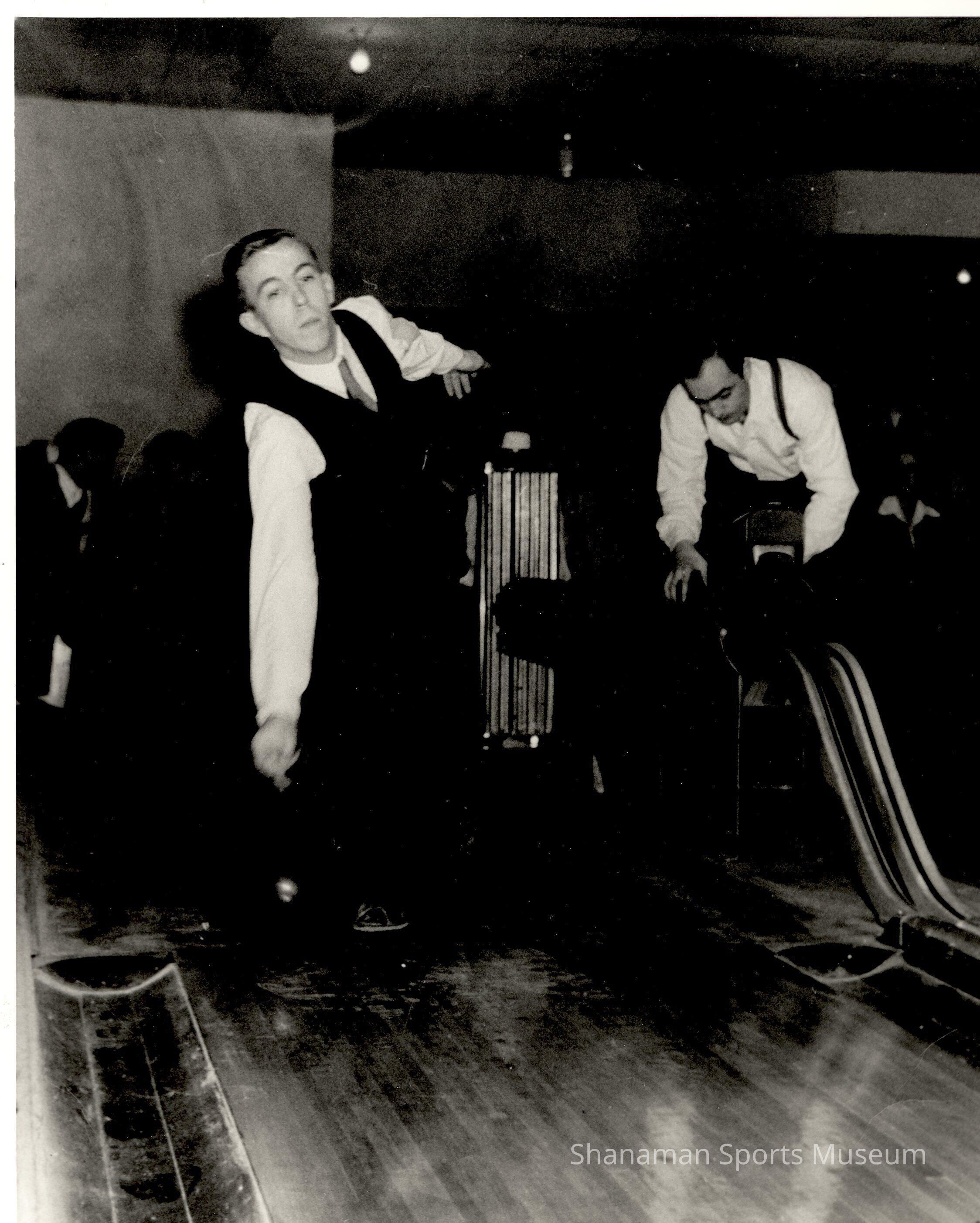 Wearing a vest with a white shirt and tie, Bill Ruehel lets loose with a shot as he bowls in the photo taken in the late 1940s. Besides bowling, Ruehel also played softball and was on the Tacoma Elks softball team. In 1948, Ruehel played for the Tacoma Elks Club softball team that won the city league championship and placed second in state.