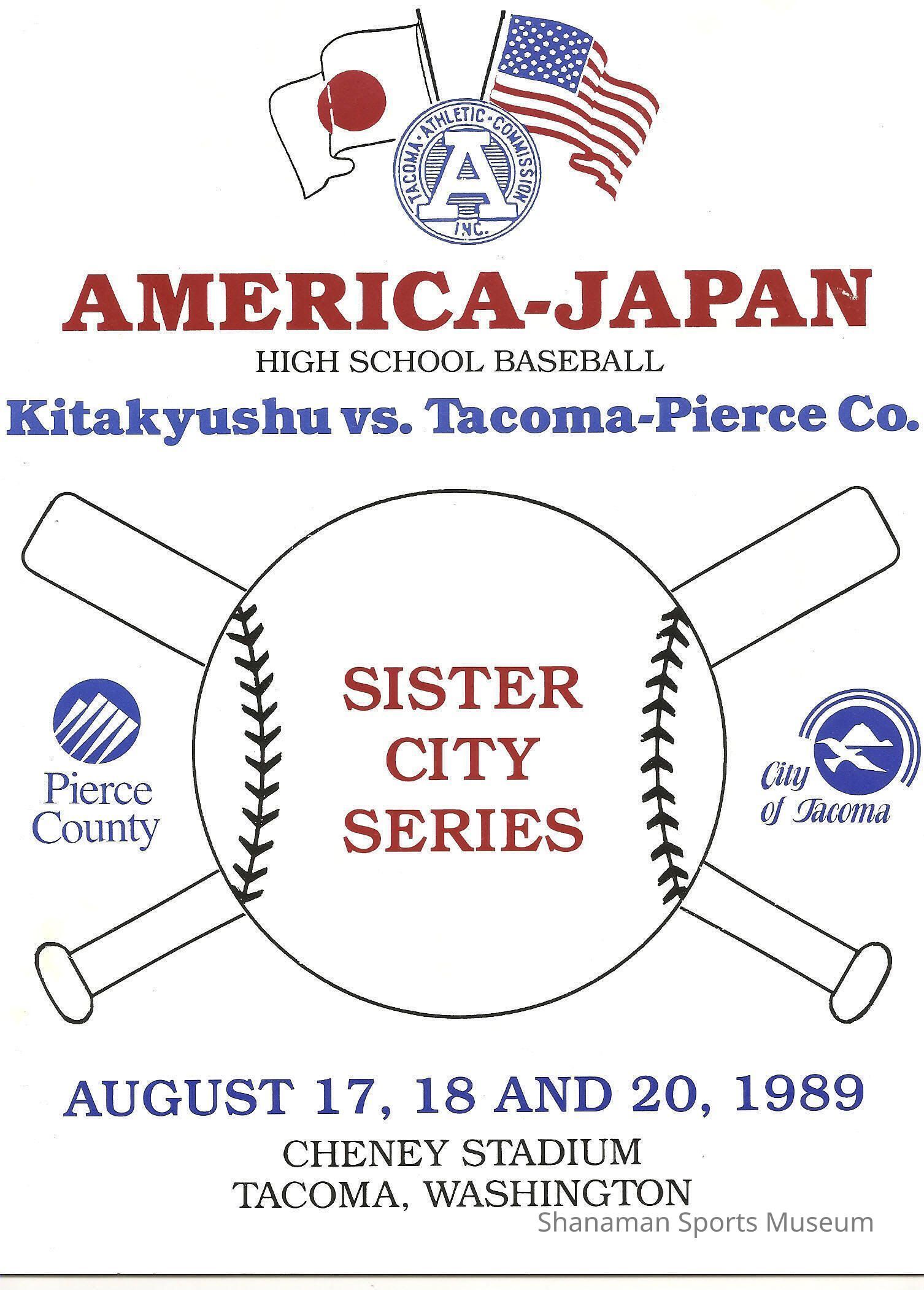 Program- baseball, America-Japan Sister City Series, Kitakyushu vs. Tacoma-Pierce Co. August 17, 18, 20 at Cheney Stadium, high school