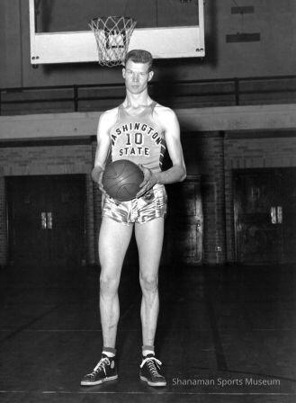 Vince Hanson was a three sport star at Washington State after he graduated from Tacoma’s Lincoln High School in 1942. He wore jersey #11 at WSU. A 6-foot, 10-inch center, he set a national single season record in 1944-45 when he scored 592 points for the Cougars, who won the Pacific Coast Conference championship. He was a consensus second-team All-American and finished his career with 1,153 points. He twice lettered in both baseball as a first baseman and in track and field as a high jumper. After his senior year of basketball he was drafted by the Baltimore Bullets of the fledgling NBA. He never played for the Bullets, instead joining the Goodyear Wingfoots of Akron, Ohio, at a time when AAU basketball enjoyed wide popularity. Photo courtesy of Hutchinson Photo Service.Lexicon