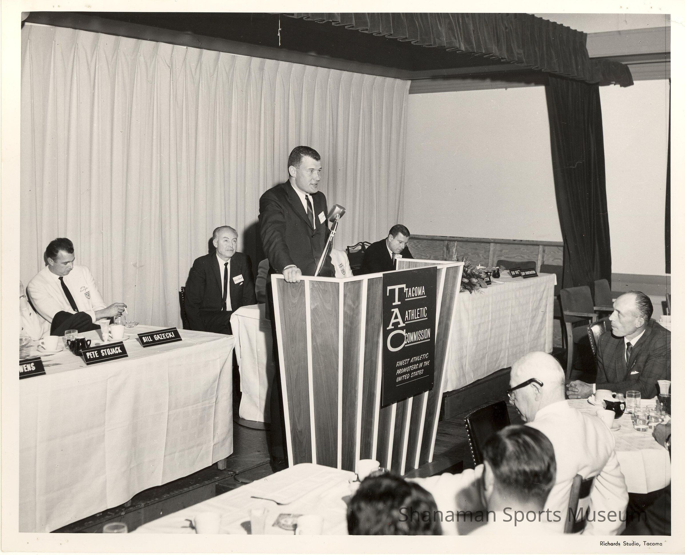 Legendary University of Washington football coach Jim Owens addresses a Tacoma Athletic Commission gathering. Owens coached the Huskies (1957-74), winning the Rose Bowl after the 1959 and ‘60 seasons. His 1960 team finished the season ranked No. 6 in the Associated Press poll and No. 5 in the Coaches Poll, but the Helms Athletic Foundation ranked UW No. 1 allowing the 10-1 Huskies to claim a share of the national title (along with Iowa, Minnesota, Ole Miss and Missouri). Owens resigned from UW with a 99-82-6 record in ‘74 and was replaced by Don James.Lexicon