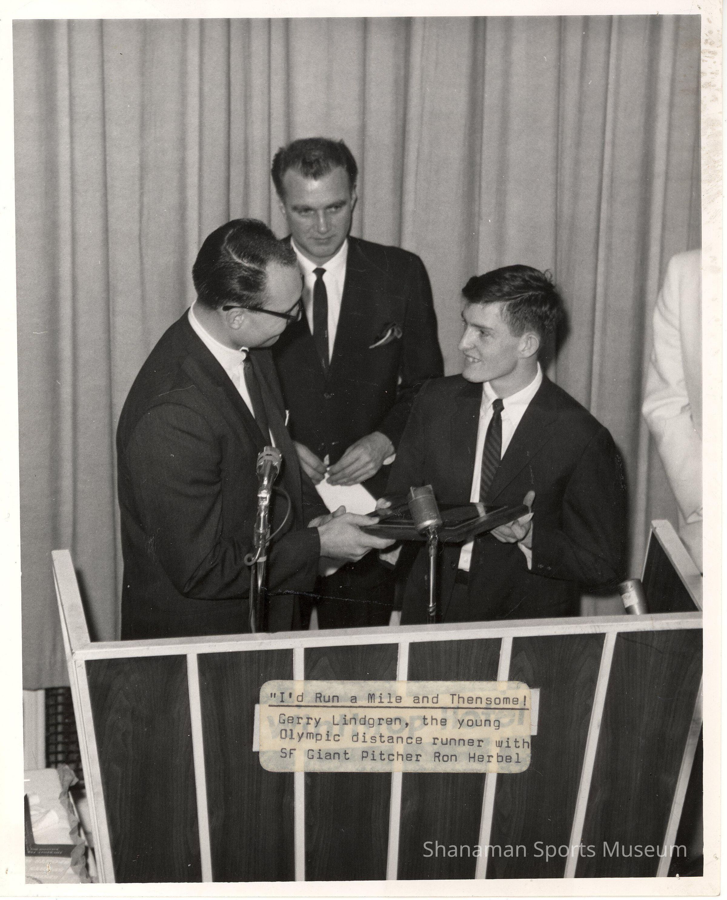 Standout distance runner Gerry Lindgren, right, accepts an award in a 1965 photograph with Tacoma Giants pitcher Ron Herbel, center, and an unidentified man.