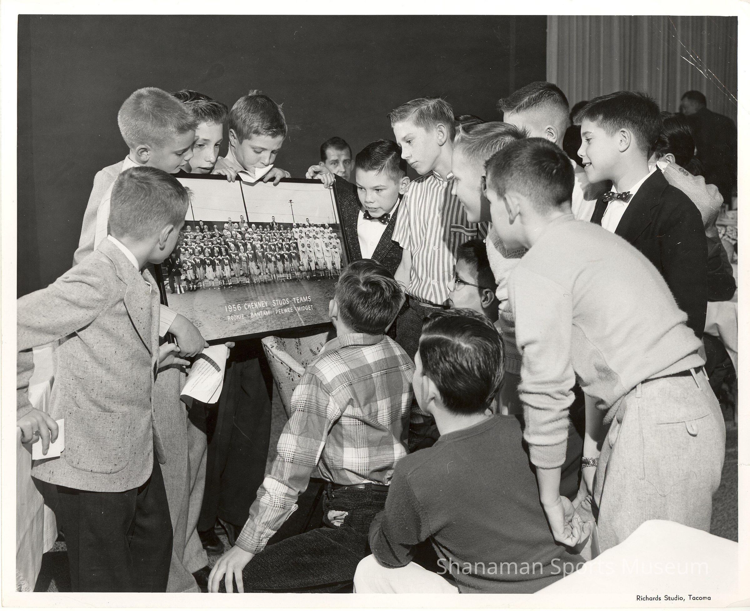 A group of boys look at a large, framed photo of the 1956 Cheney Studs teams in Rookie, Bantam, Pee Wee, and Midget leagues. The Cheney Studs were sponsored by sports enthusiast and philanthropist Ben Cheney. Cheney himself was an avid baseball fan but came from a low-income family who couldn’t afford his own baseball gear. Cheney grew up to sponsor numerous teams, of both sexes, and by his death in 1971 it was estimated Cheney had helped more than 5,000 youth through sponsorship by the Cheney Lumber Company, which was founded by Cheney in 1936. The youth program also included baseball, hockey, and basketball and started in the mid-1950s.Lexicon