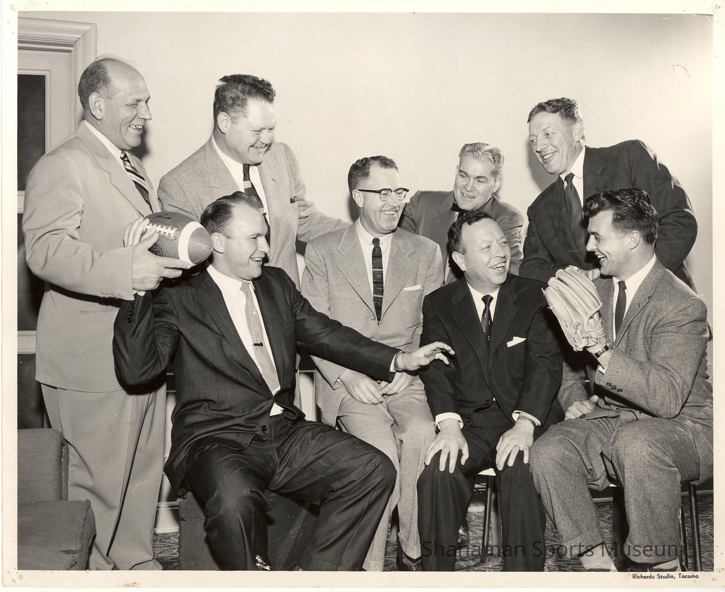 Photo, b/w, 8 men in suits. Ben Cheney is 2nd from right, front row, laughing with man at far right holding up baseball glove. Man at far left, front row, is posed as if throwing football. Photo by Richards Studio.Relationships