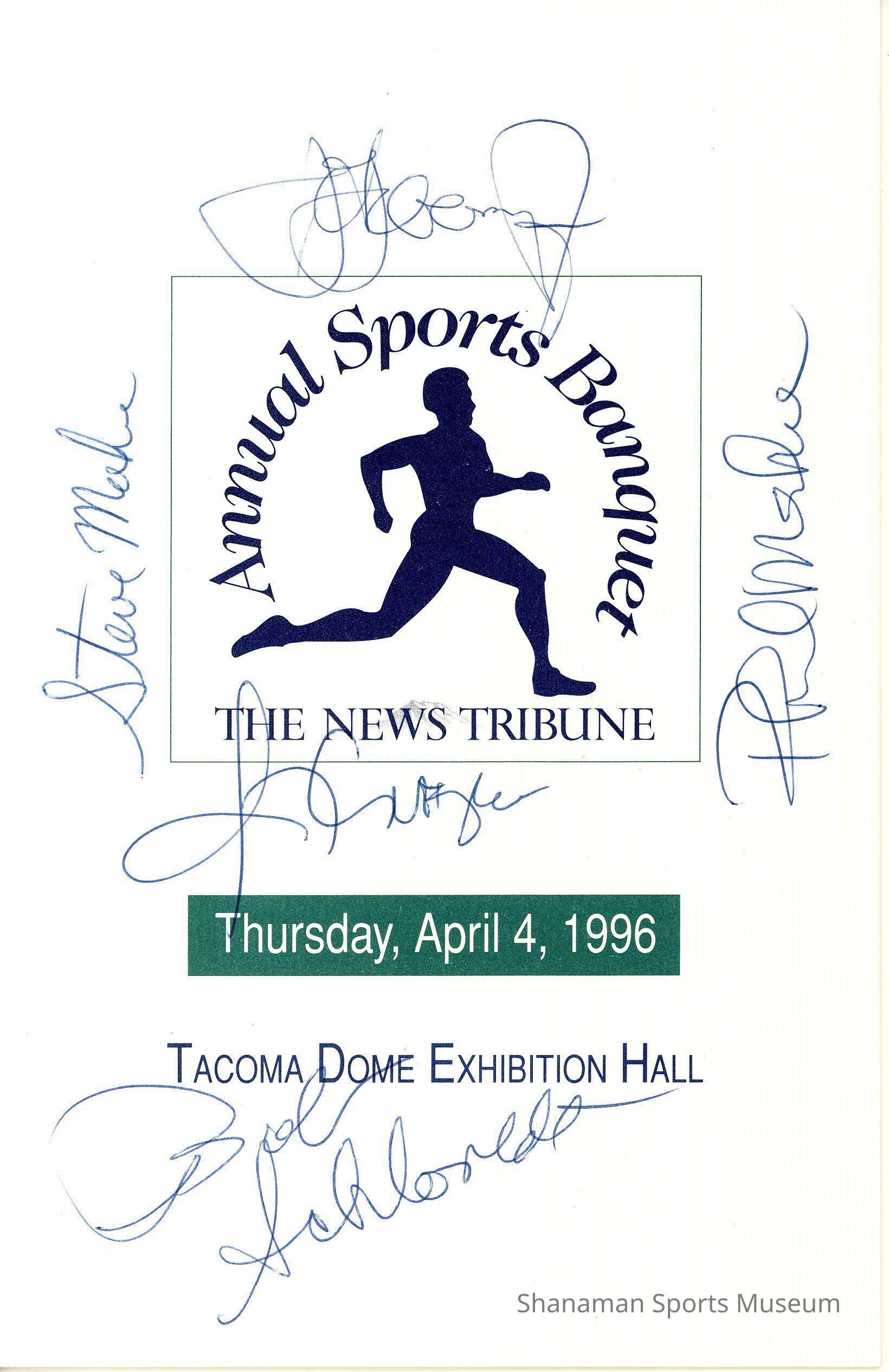 Program- Annual Sports Banquet, The News Tribune, Tacoma Dome Exhibition Hall, April 4, 1996. Cover signed by Phil Mahre, Steve Mahre, Ahmad Rashad, Stan Sayers, Bob Schloredt.
