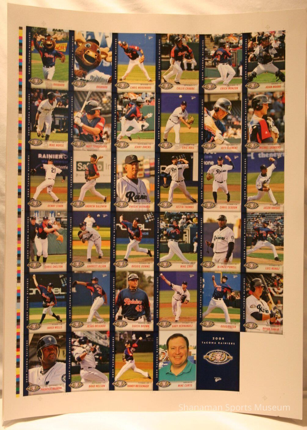 Poster- uncut sheet of 2009 Tacoma Rainiers trading cards, photos on the front with stats on back.
