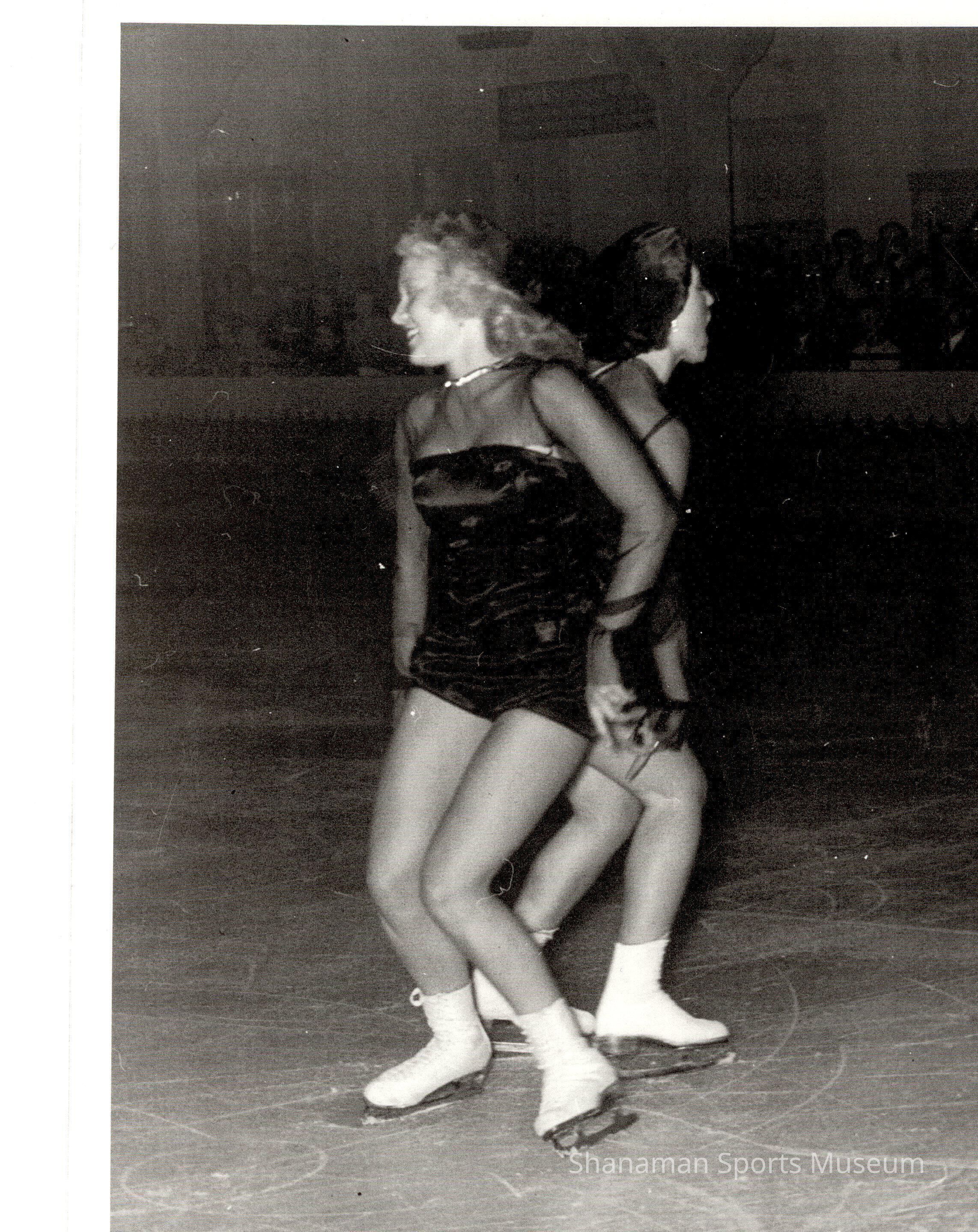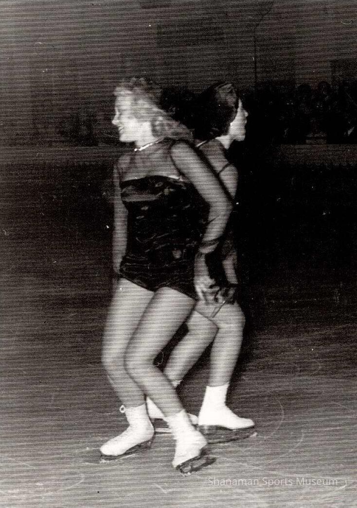 Photo of Patsy Hamm and Ladies Pairs Division partner Diane Jacobsen. Patsy (Hamm) Dillingham began skating in 1942 when she and her family moved from Eatonville to Lakewood. Hamm and her partners won the Northwest and Pacific Coast Junior Pairs and Ladies Pairs events by 1948. In 1949 Hamm won the Northwest Novice Ladies title and placed fourth in the U.S. North American team Senior Pairs. Her success continued in 1950 when she won Northwest Junior Ladies and Northwest and Pacific Coast Senior Pairs championships. Hamm, a Clover Park graduate, began skating professionally in 1951 and teaching classes at the Lakewood rink. Among her top students were Jerry and Julianne Fotheringill, two-time national pairs champions. Hamm was inducted into the Tacoma Sports Hall of Fame in 2005. Identified as Boogie Woogie number below.