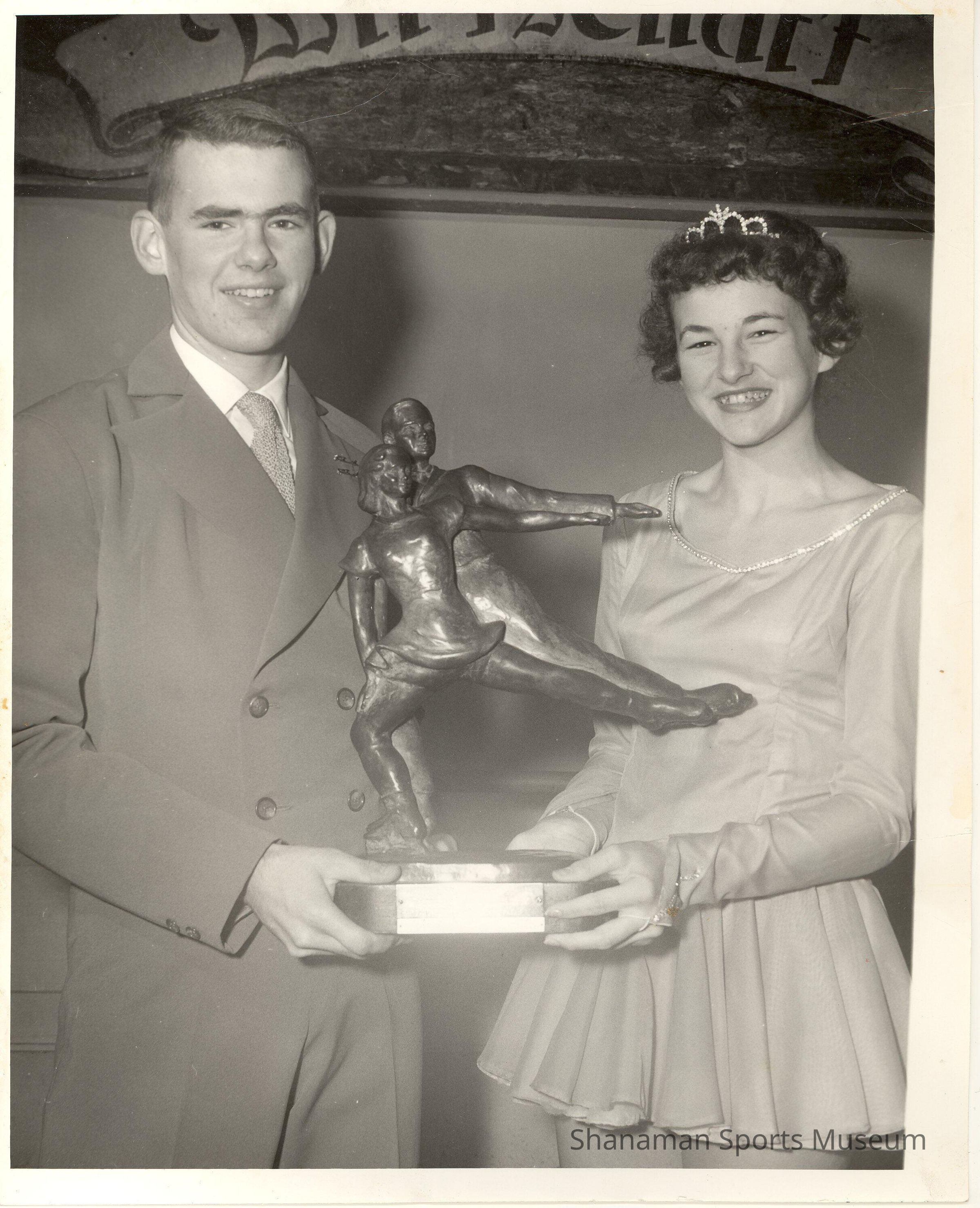 Siblings Judianne and Jerry Fotheringill quickly gained prominence after starting skating lessons with coach Patsy Hamm and finished second at their first Northwest regional pairs ice skating competition. The pair went on to win their first U.S. Junior Pairs championship in 1959, placing fourth. Two years later they must missed making the World team at the senior level and contemplated retirement. But the Fotheringill’s persevered and won national titles in 1963 and 1964 and represented the US at the 1964 Olympic Games. Jerry and Judianne were inducted into the Tacoma Sports Hall of Fame in 2005. Pictured are Jerry and Julianne holding their second-place trophy from the 1959 National Junior Pairs Championships.