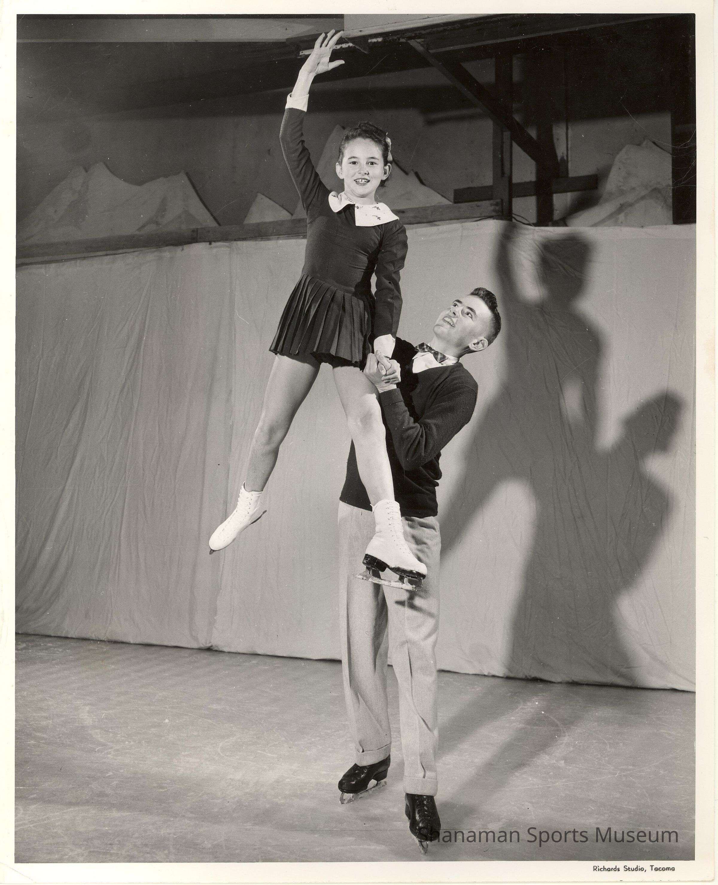 Photo, b/w, young Judianne and Jerry Fotheringill posed on the ice. He wears pants and v-neck sweater and holds her up in the air. She wears dark costume and holds one hand in the air. Cloth backdrop behind. Photo by Richards Studio, Tacoma.Lexicon