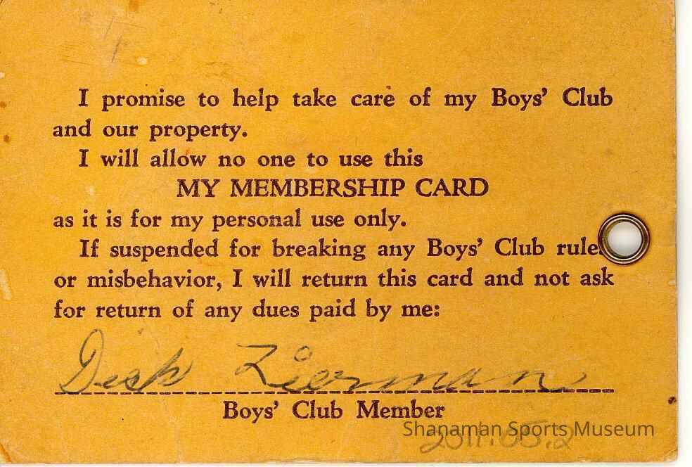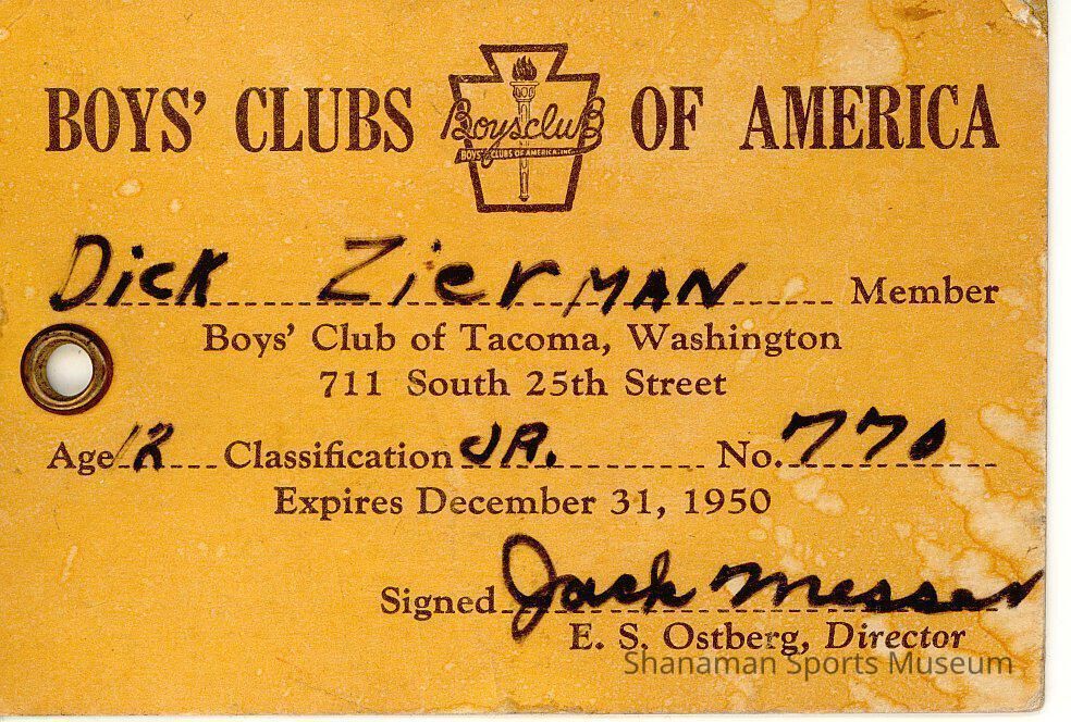 Membership Card for Richard (Dick) Zierman for the Boys' Club of America for 1950. Zierman was 12 years old.