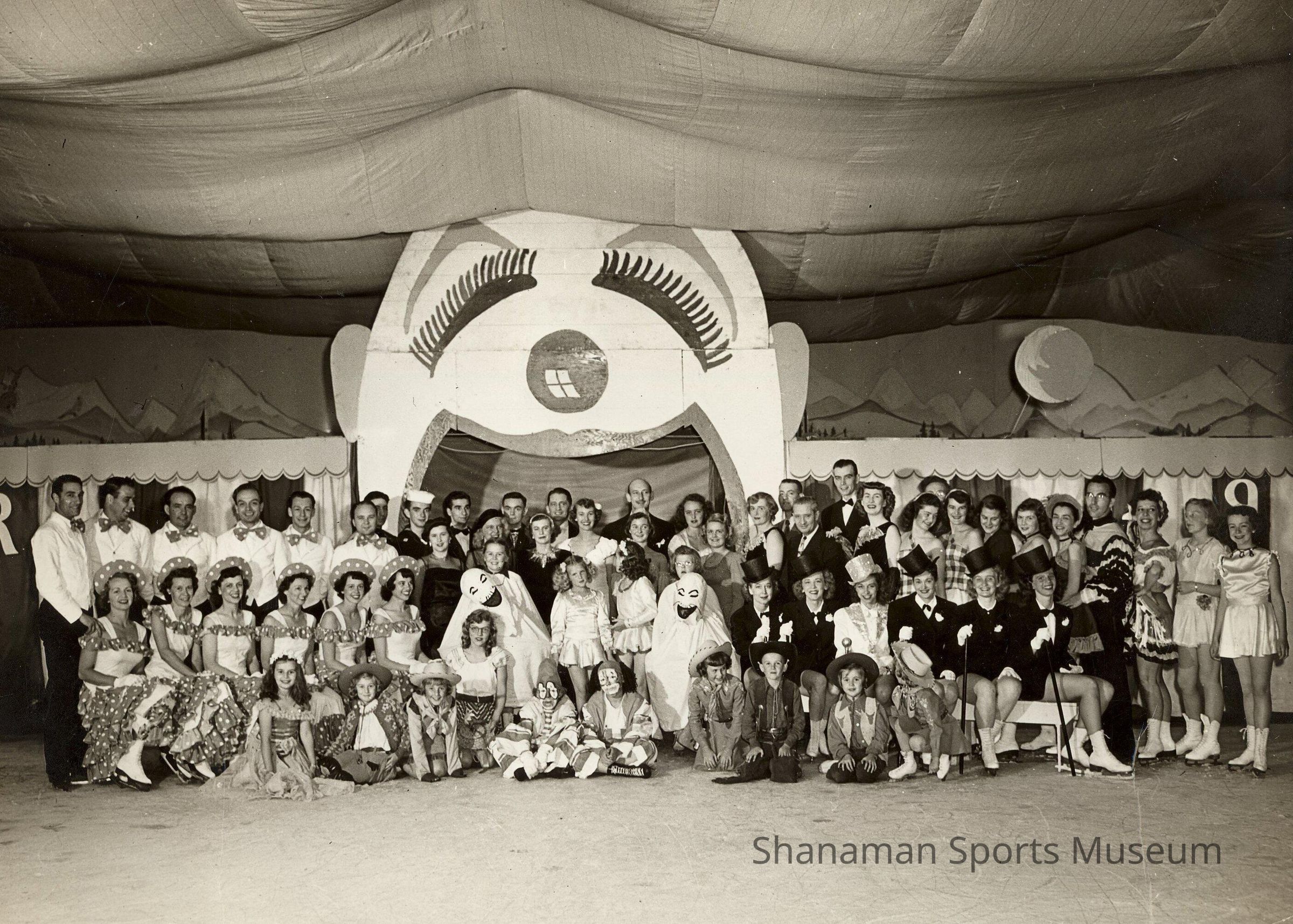 Photo, b/w, Ice Capers. Group photo of 60 skaters on the ice, in costumes, in front of large clown head set.
