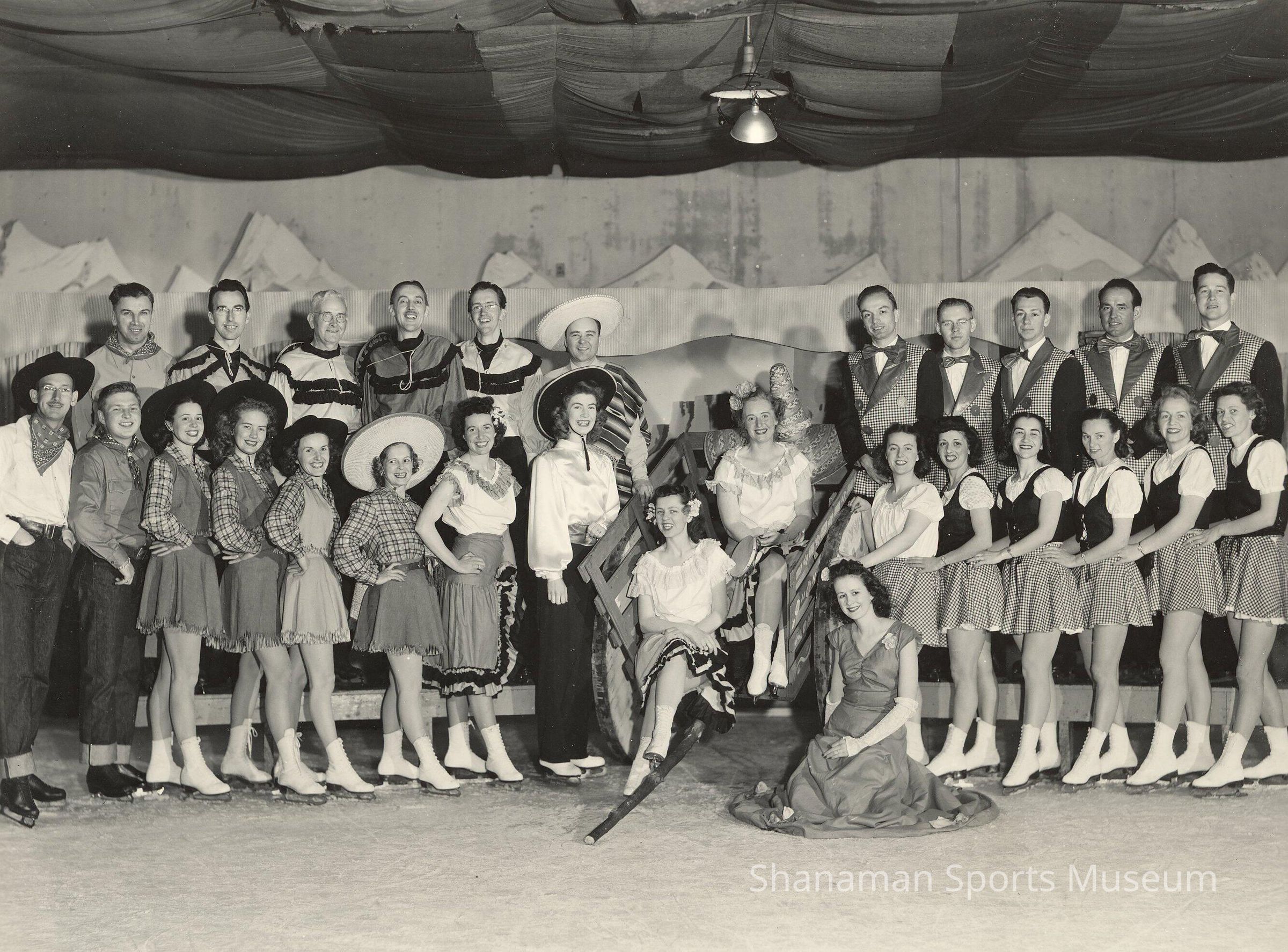 The senior dance club for the Lakewood Winter Club Ice Show pose on ice in 1947. By 1955 the show had eight performances and 175 skaters. The rink hosted numerous shows and was the entertainment hub for Tacoma residents until 1982 when part of the building collapsed and the rest was demolished. Photo by Mr & Mrs Claude Harta Studio, Tacoma.