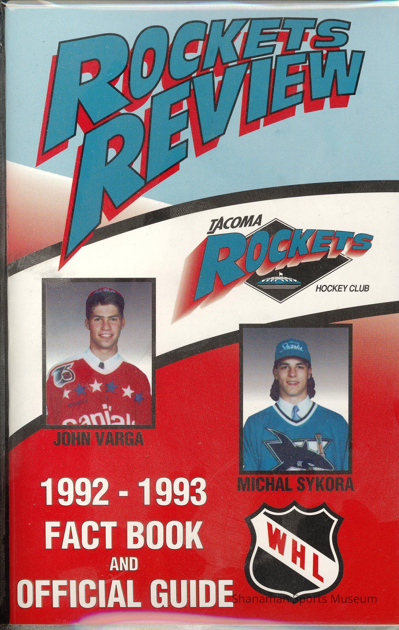 Program- Rockets Review, 1992-93 Tacoma Rockets Hockey Club fact book & official guide. Michal Sykora and John Varga on cover.