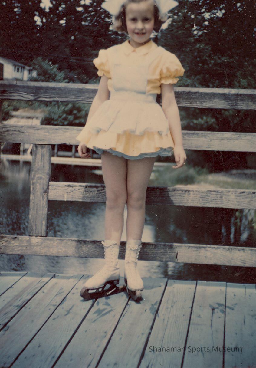 As a young girl, Betty Blair poses for a photo wearing an ice skating costume with a large bow in her hair. When she grew up, Blair turned to professional skating and starred with the Ice Capers Show for many years.