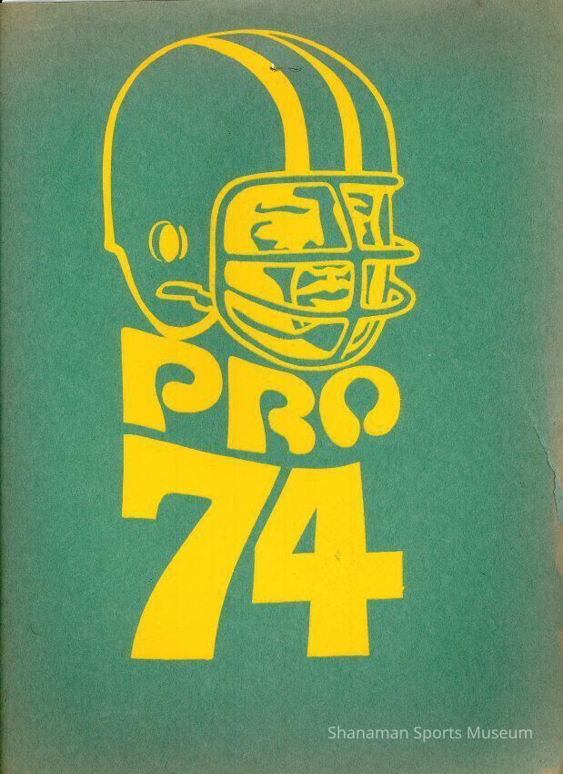 Program - Bengals vs. Cavaliers, 1974; roster sheets stapled into green paper folder with yellow football helmet logo and written letters "Pro 1974"; Rosters organized by player number, name, includes position and weight; Head Coach, Assistant Coach, General Mananger, Team Physician & Trainer, Equipment & Statistics, Reciever & QB Coach, Backfield Coaches, Line Coaches for teams at bottom of pages