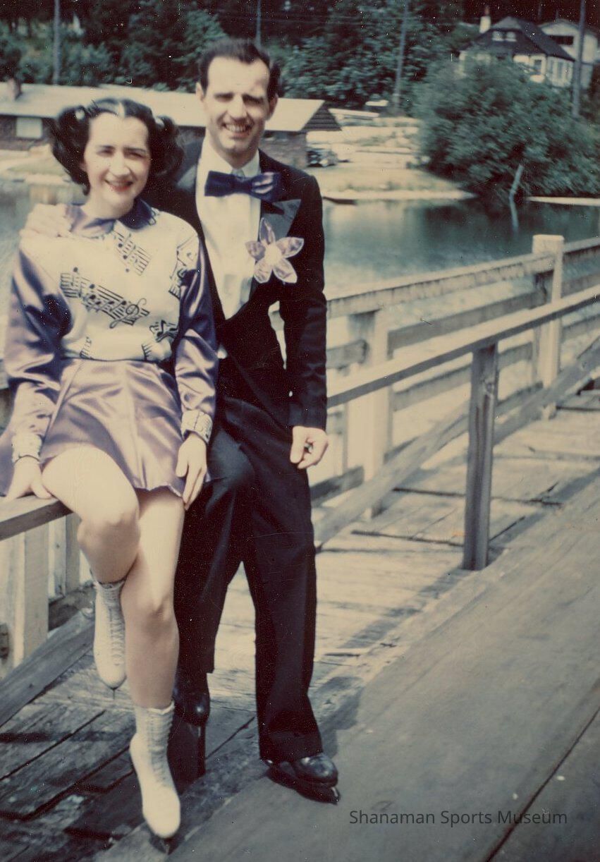 Monica Wilson and Tom Hoskins, posing in ice skating costumes on the dock overlooking the lake, were one of numerous skaters who performed at the Lakewood Ice Arena. The ice arena was home to many top level skaters when it opened in the 1930s. It was a popular hangout spot for families and couples, and teenagers. The ice arena was home to many top level skaters when it opened in 1930s.Lexicon