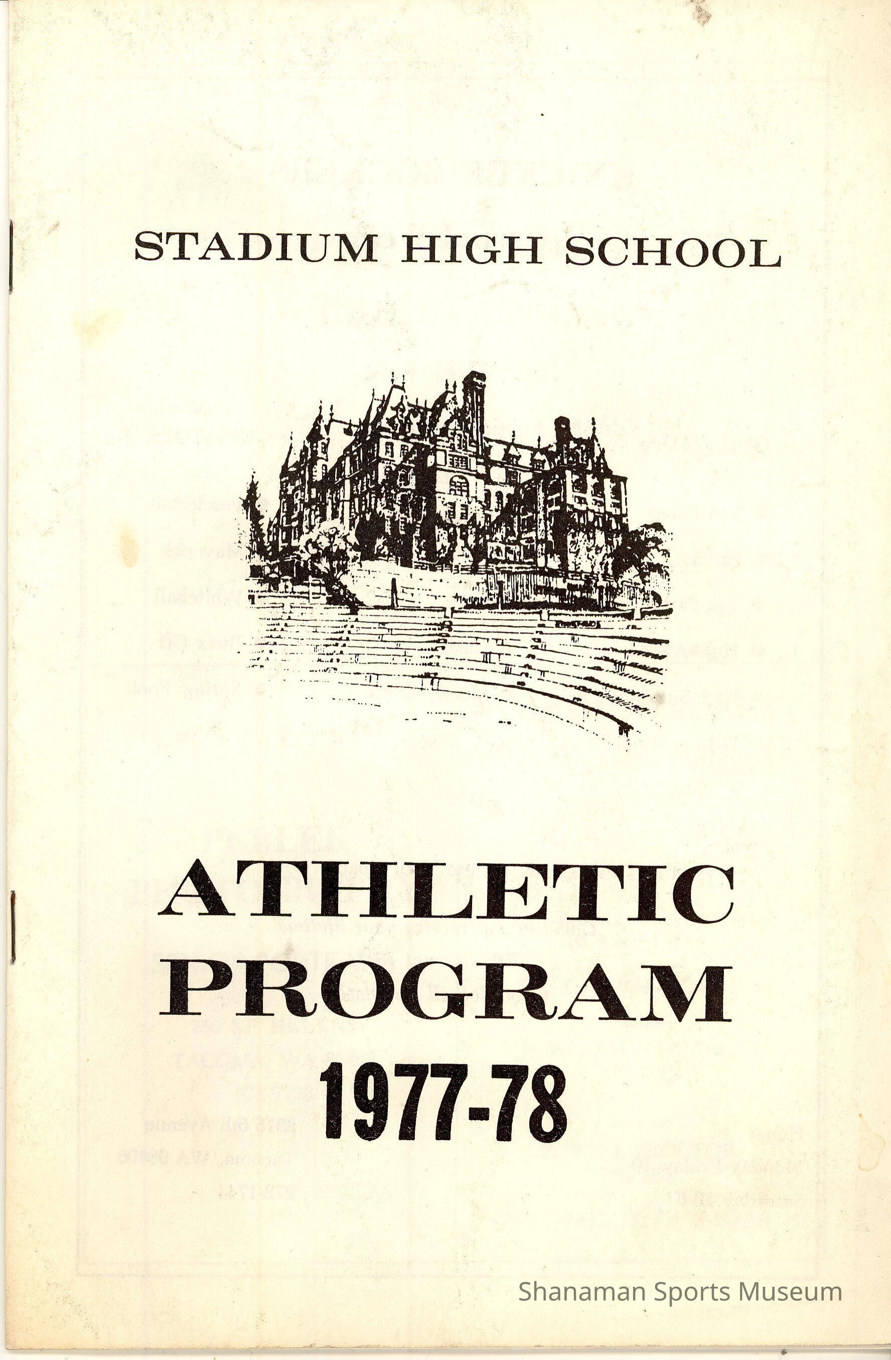 Program - Stadium High School Athletic Program, 1977-78; white program with black and white etched drawing of high school featured on front; Roster inside program for the Stadium Tigers football team against Mt. Vernon Bulldogs; Roster details game results and an advertisement for "Next Weeks Game - Stadium Bowl - Sept 30, Tigers vs. Wilson Rams"