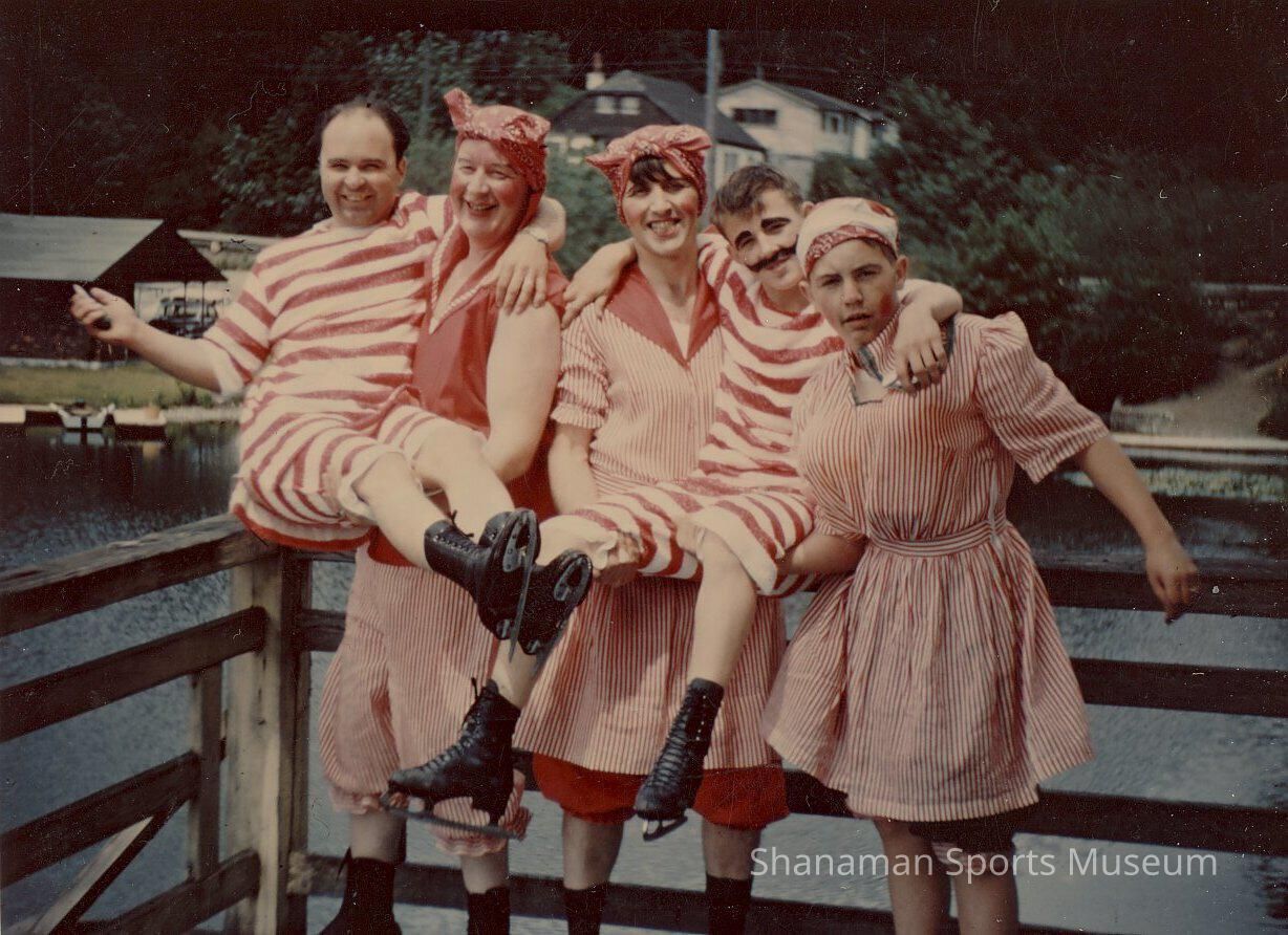 In this lively snapshot that's a promotion of the 1950 Hamm & Riggs Comedy Act, these five comedians gag it up dressed in red and white old fashion swim costumes. Four of them identified are (from L to R) Andy Coppock, Ray Campbell, ?, Larry Hamm and David Riggs.Lexicon