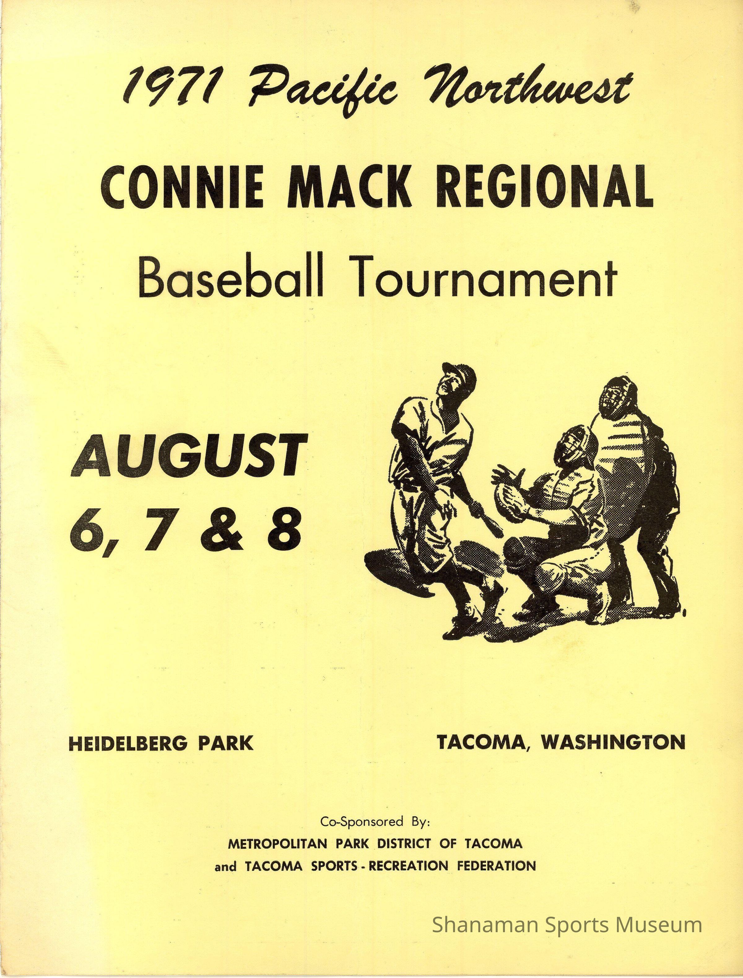 Program- 1971 Pacific Regional Connie Mack Baseball Tournament; held at Heidelberg Park in Tacoma, Washington; August 6, 7, and 8, 1971; Co-sponsored by Metropolitan Park District of Tacoma and Tacoma Sports-Recreation Federation; Program is yellow with black lettering with a graphic of a batter, catcher, and umpire in the center