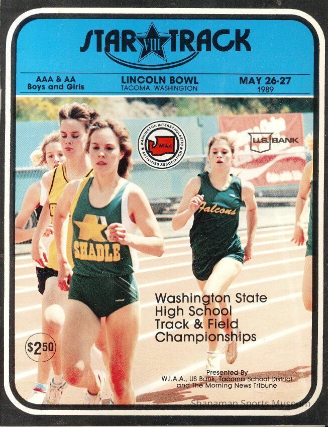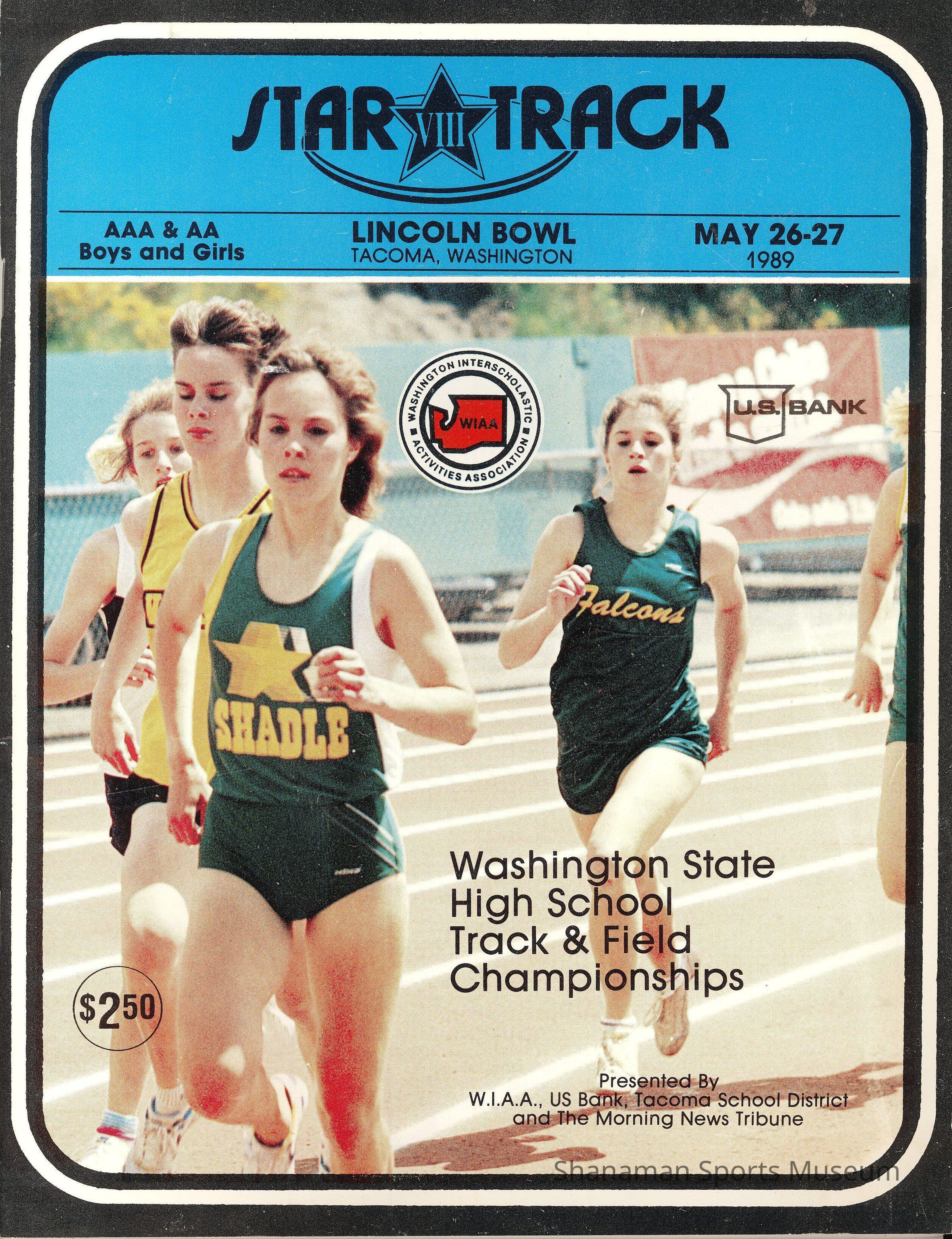Program- Star Track VIII, Lincoln Bowl, Tacoma, Washington, May 26-27, 1989; AAA & AA Boys and Girls; Washington State High School Track & Field Championships, presented by WIAA, US Bank, Tacoma School District and the Morning News Tribune; program features black lettering with a full page photo of women running on a track