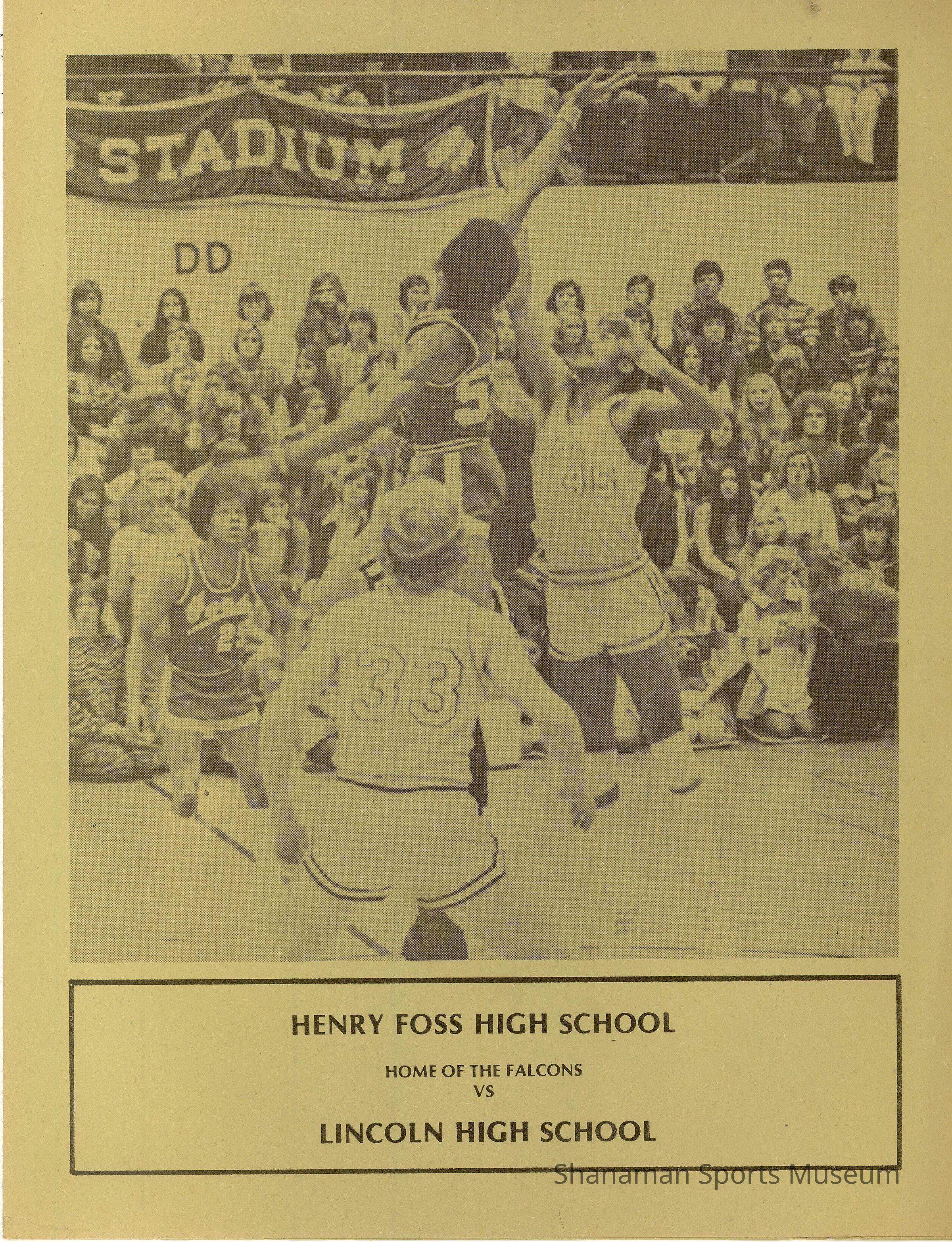 Program- from Henry Foss High School, Home of the Falcons vs Lincoln High School; basketball program; from 1974-1975 Henry Foss High School Basketball team season; program is olive green with black lettering and a b/w photo of basketball players jumping for a basetball in a gymnasiumArchive Details