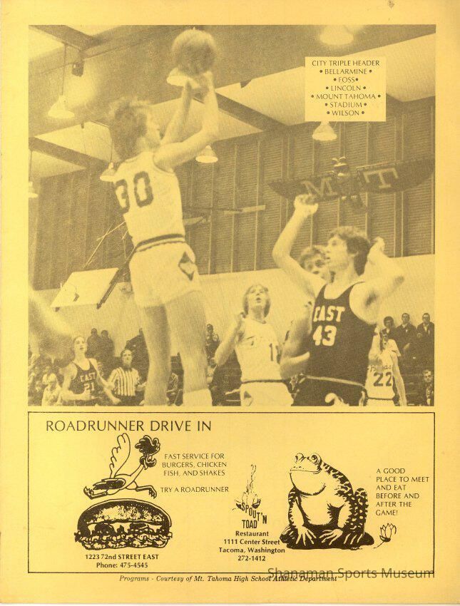 Program- for Mt. Tahoma High School Basketball; city triple header with Bellarmine, Foss, Lincoln, Mount Tahoma, Stadium, Wilson high schools; program is gold with black lettering, sponsor advertisements, and a large b/w photo of a male basketball player going up for a jump shot in a gymnasium