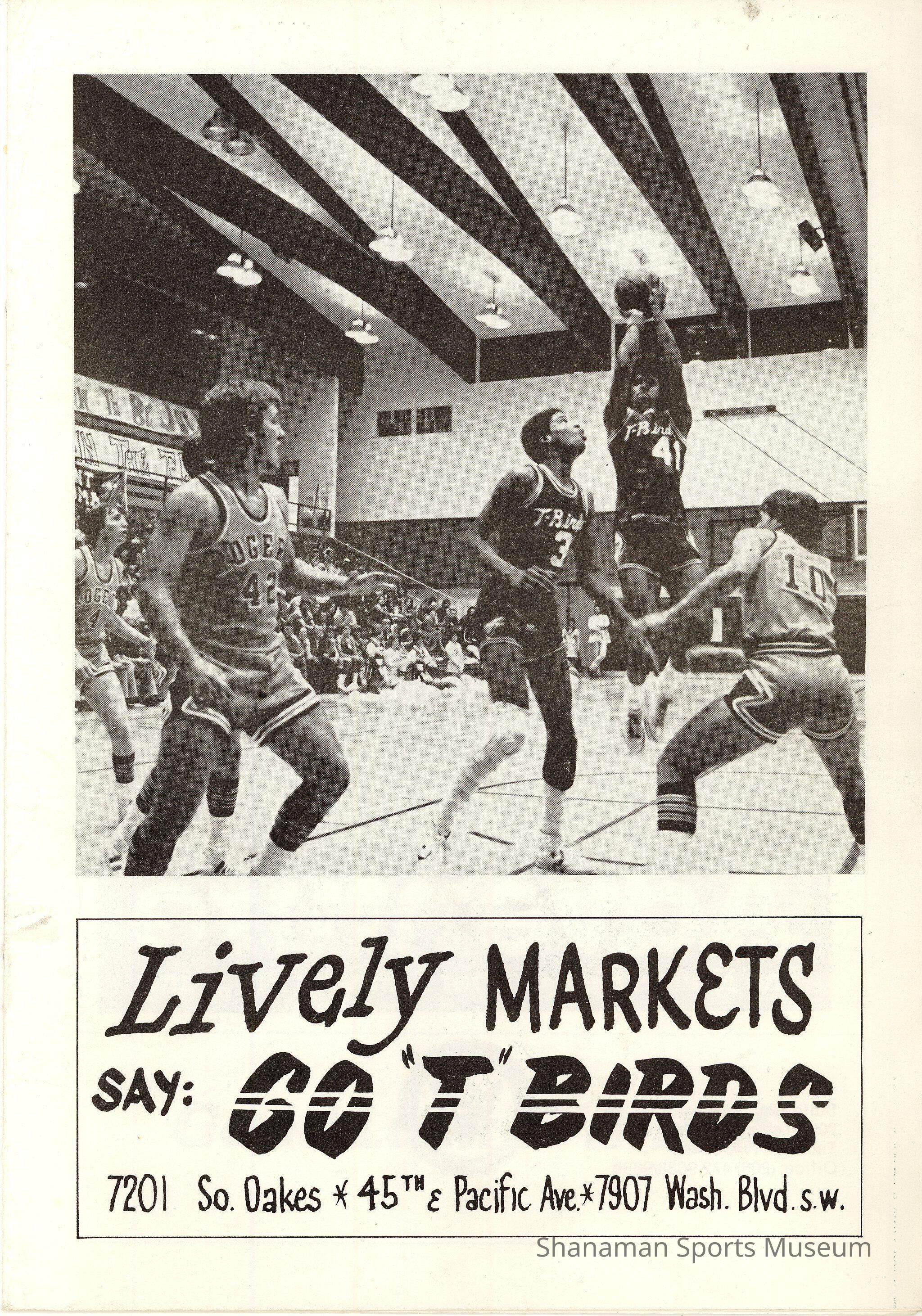 Program- Mount Tahoma Thunderbirds vs. Lincoln High School, 1976-1977; program is white with black lettering "Lively Markets Say: Go 'T' Birds" 7201 So. Oakes * 45th E Pacific Avenue *7907 Wash. Blvd. S.W." and features a b/w photo of male basketball players in the act of shooting the basketball in a gymnasiumArchive Details