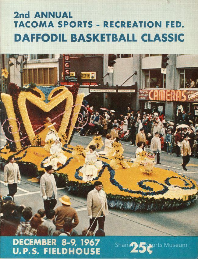 Program- 2nd Annual Tacoma Sports - Recreation Federation Daffodil Basketball Classic, December 8-9, 1967, U.P.S. Fieldhouse; program is light and dark blue with blue or white lettering and features a color photo of a parade float