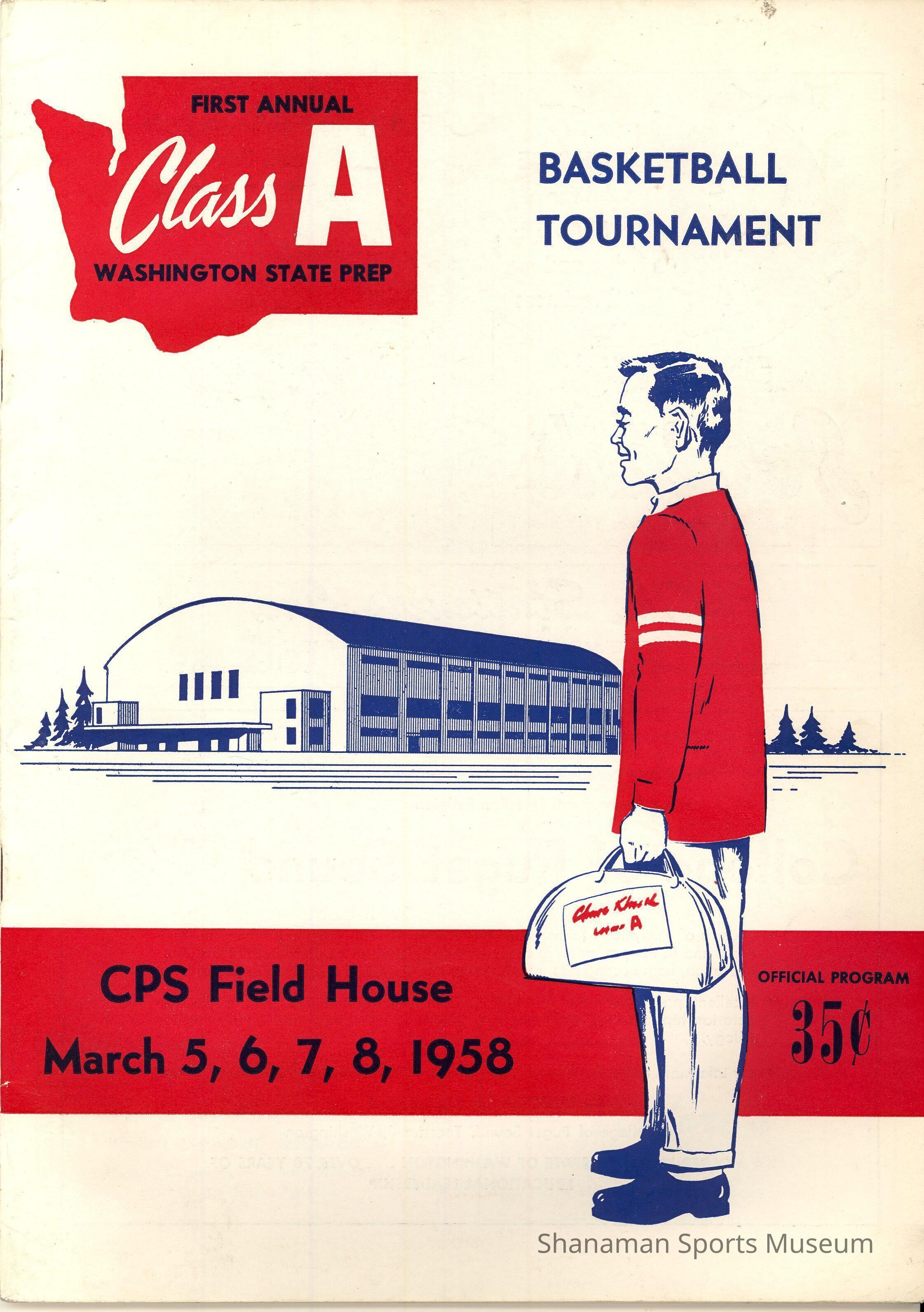 Program- First Annual Washington State Prep Class A Basketball Tournament, March 5, 6, 7, 8, 1958, at CPS Field House; program is white with blue and white lettering and features a drawing of a gymnasium and a male figure standing in a red sweater facing the gymnasium
