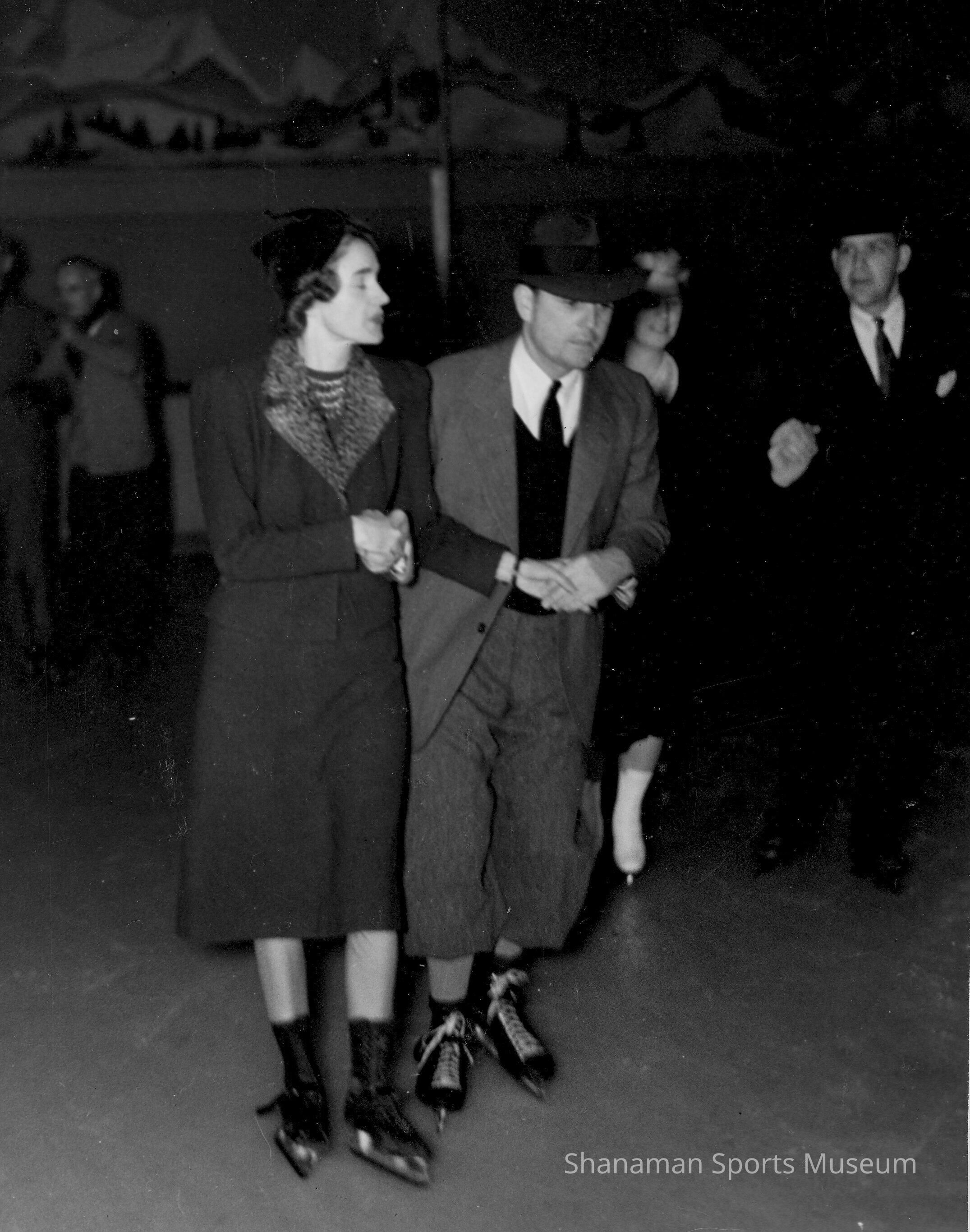 Couples skate at Lakewood Ice Arena, circa 1940. The arena was the place to be for Tacoma residents. It quickly became an entertainment hub when it opened in 1938. The rink continued to provide skating lessons, was a popular hangout spot for teenagers, offered skating parties and hosted the Ice Follies and Ice Capades until part of the building collapsed in 1982 and the rest was demolished shortly thereafter. Photo by J. R. Eyerman, Tacoma.Made/Created