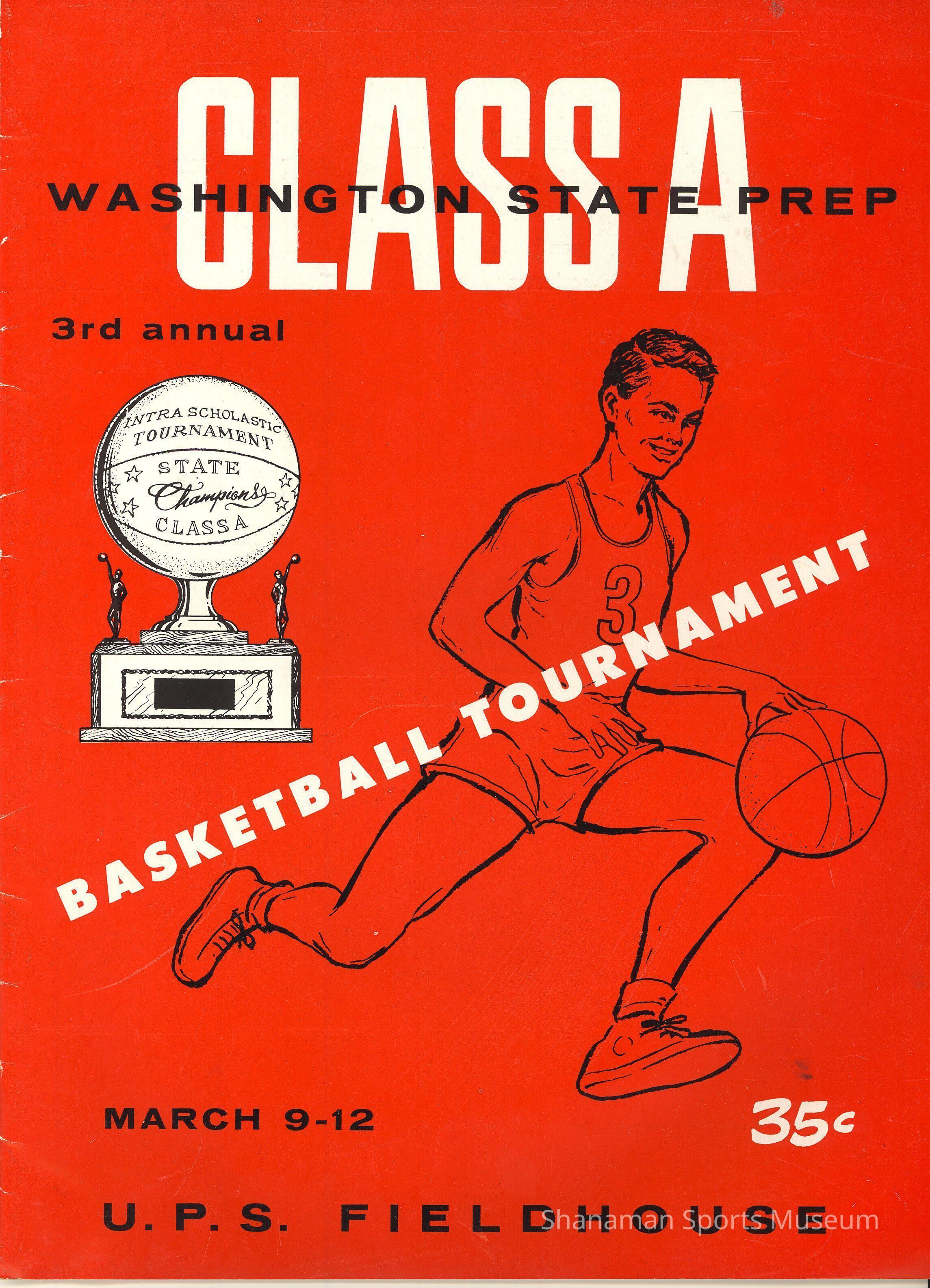 Program- Washington State Prep 3rd Annual Class A Basketball Tournament, March 9-12, 1960, U.P.S. Fieldhouse; Program is red with black and white lettering and features a graphic of a basketball trophy and male basketball player dribbling a basketball