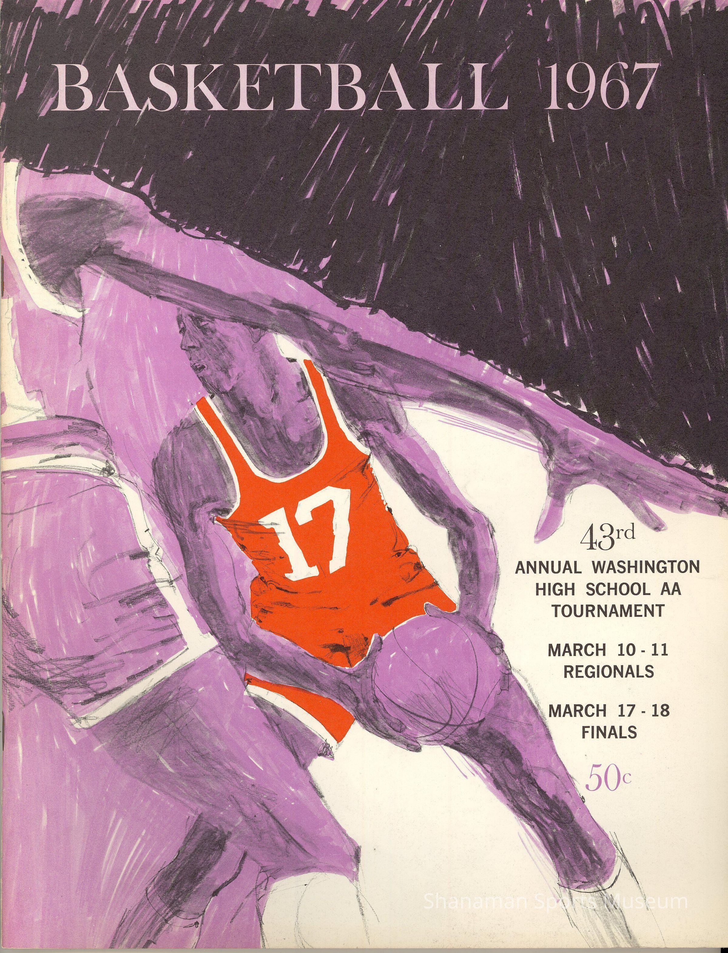 Program- 43rd Annual Washington High School AA Tournament, 1967, March 10-11 Regionals, March 17-18 Finals; program is black and purple with black and purple lettering and features a graphic of two males playing basketball