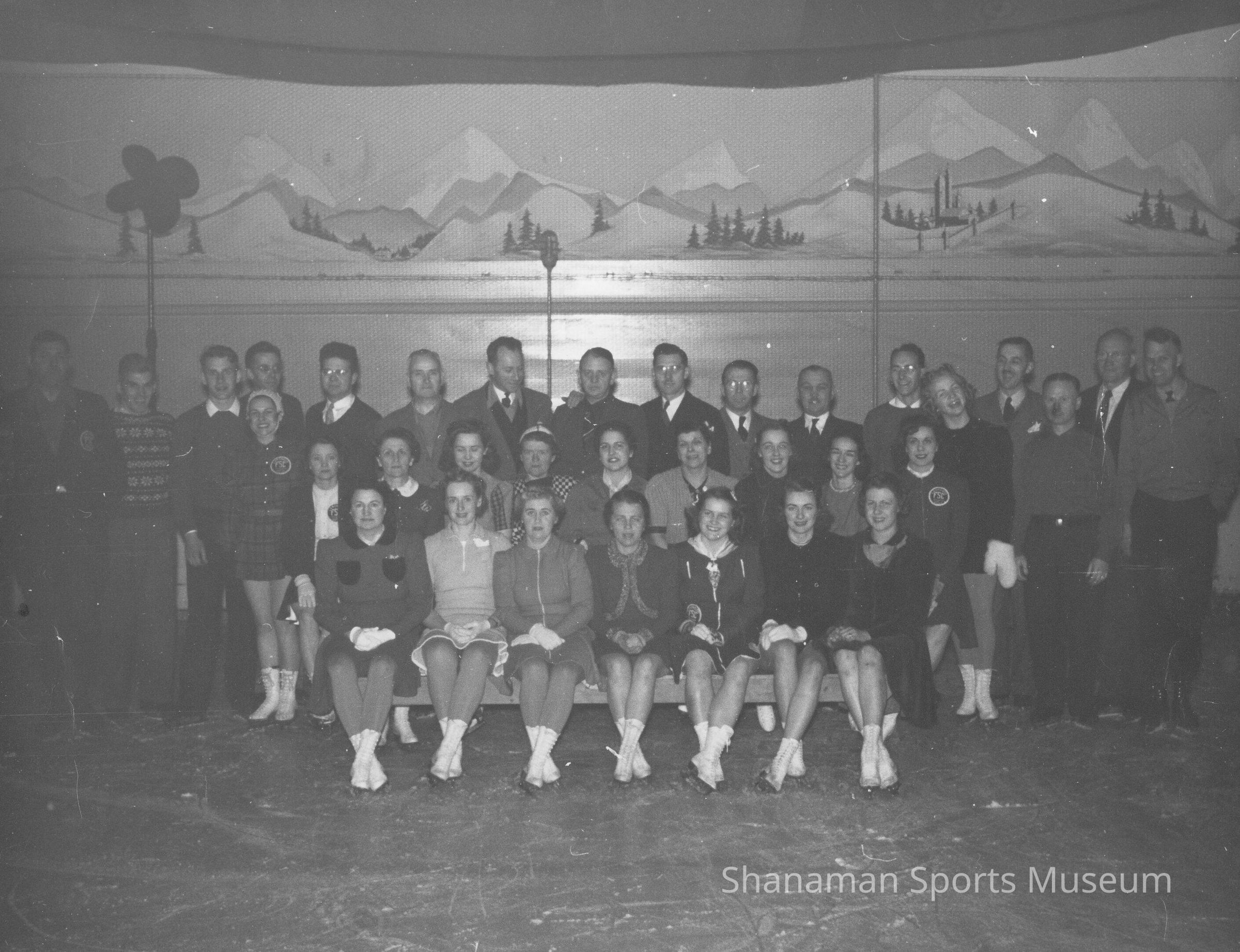 A large group of performers in the Ice Capers show at the Lakewood Ice Arena pose for a photograph including Ruth Babbit (front row, second from left) and Emily Moore (front row, third from left). By 1955 the show had eight performances and 175 skaters. The rink hosted numerous shows and was the entertainment hub for Tacoma residents until 1982 when part of the building collapsed and the rest was demolished.