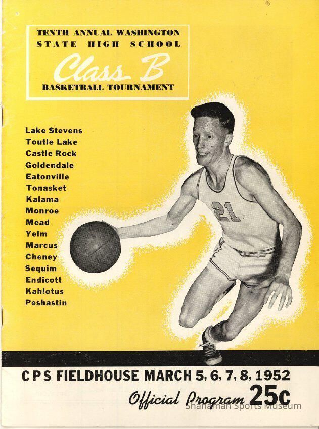 Program- Tenth Annual Washington State High School Class B Basketball Championships, March 5, 6, 7, 8, 1952, CPS FieldHouse; teams participating listed on cover: Lake Stevens, Toutle Lake, Castle Rock, Goldendale, Eatonville, Tonasket, Kalama, Monroe, Mead, Yelm, Marcus, Cheney, Sequim, Endicott, Kahlotus, Peshastin; program is yellow with white and black lettering and features a b/w photo of a male dribbling a basketball