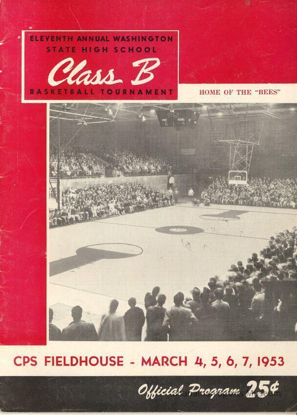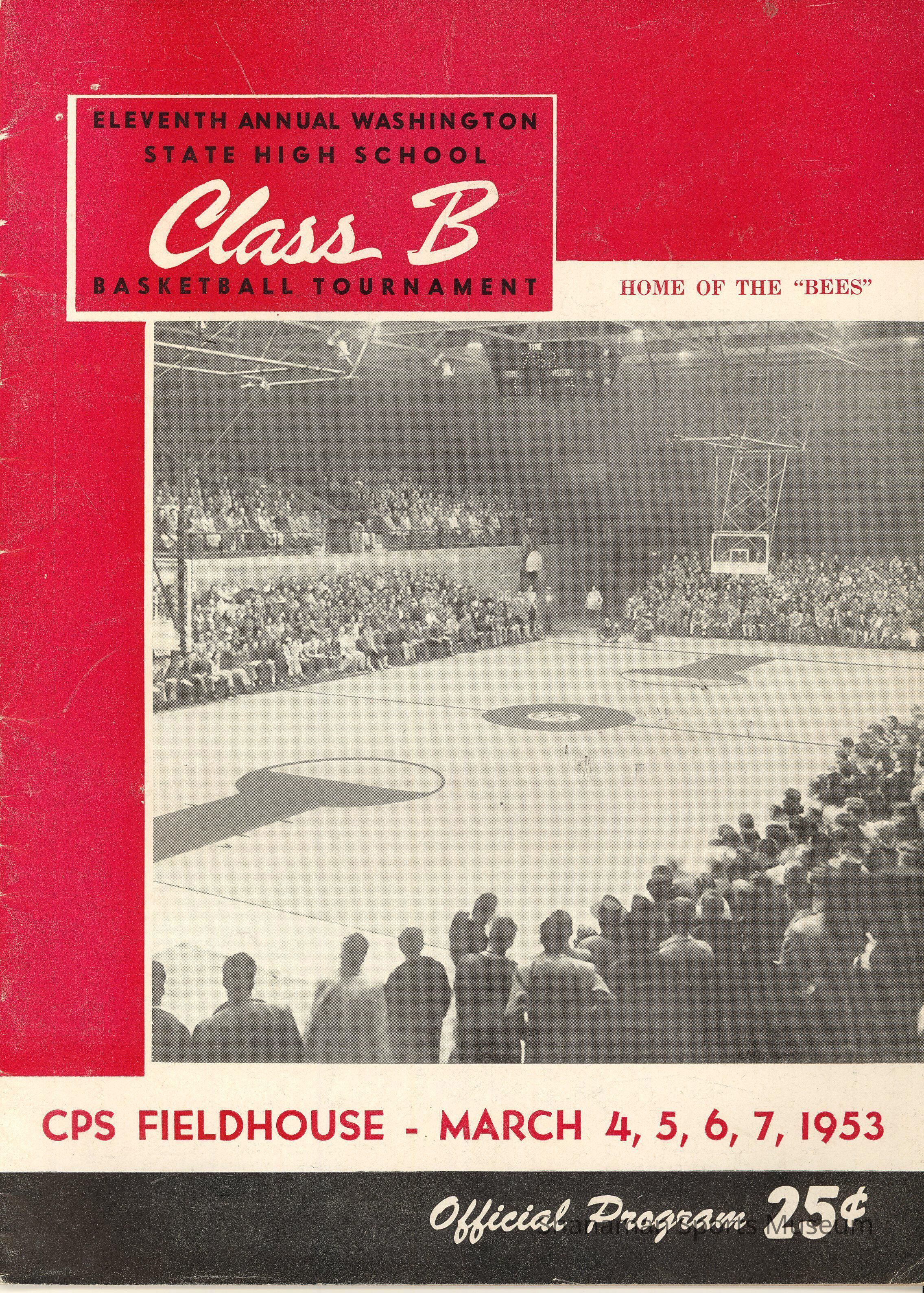 Program- Eleventh Annual Washington State High School Class B Basketball Tournament, March 4, 5, 6, 7, 1953, CPS Field House; Home of the "Bees" written on cover; program is red with black and white lettering and features a b/w photo of an interior shot of a basketball court