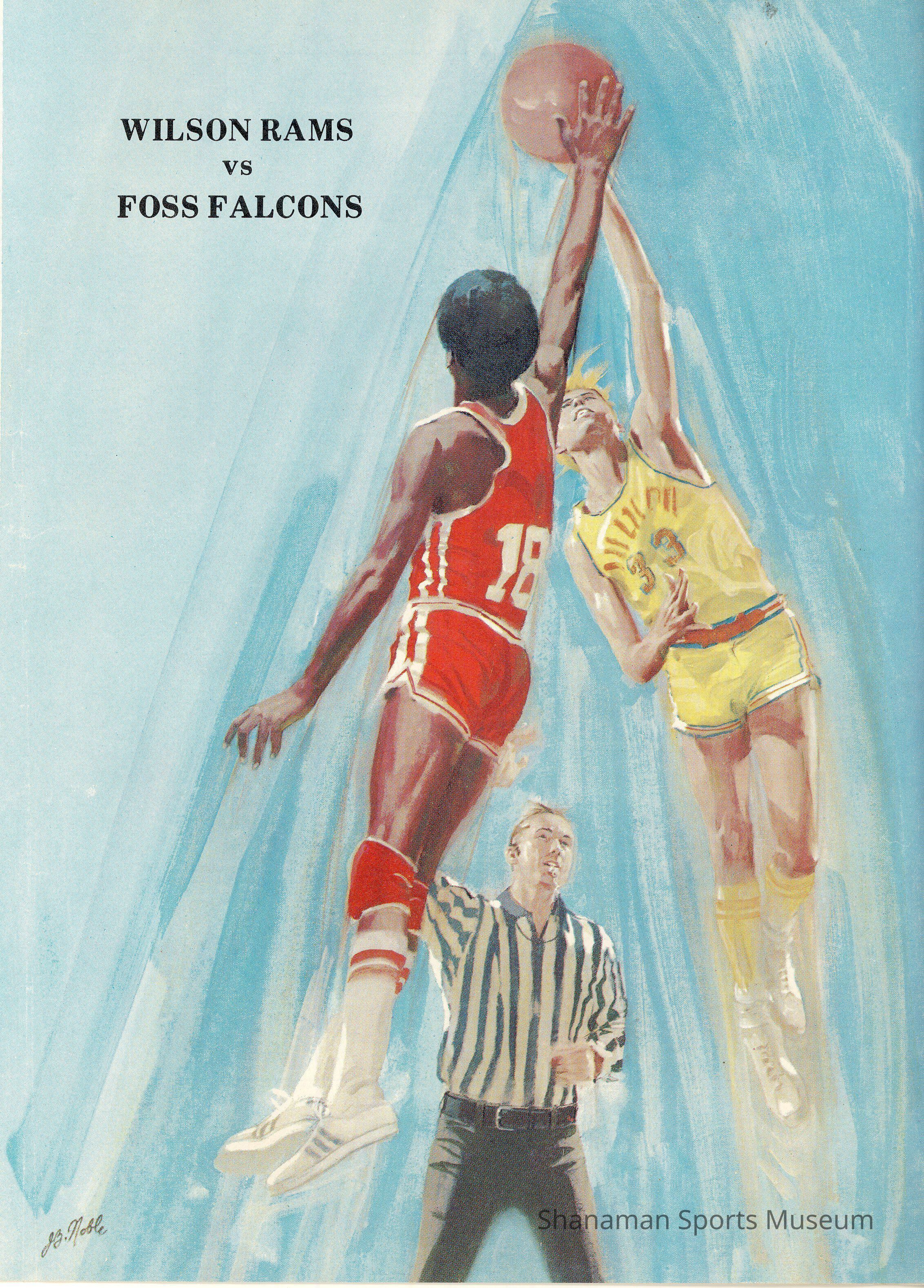 Program- Wilson Rams vs Foss Falcons, program features an artistic graphic with a referee and two males jumping for the basketball in a tip-off on a blue background; inside of program lists the team rosters, coaches, athletic directors, and shows illustrations of basketball referee hand signals