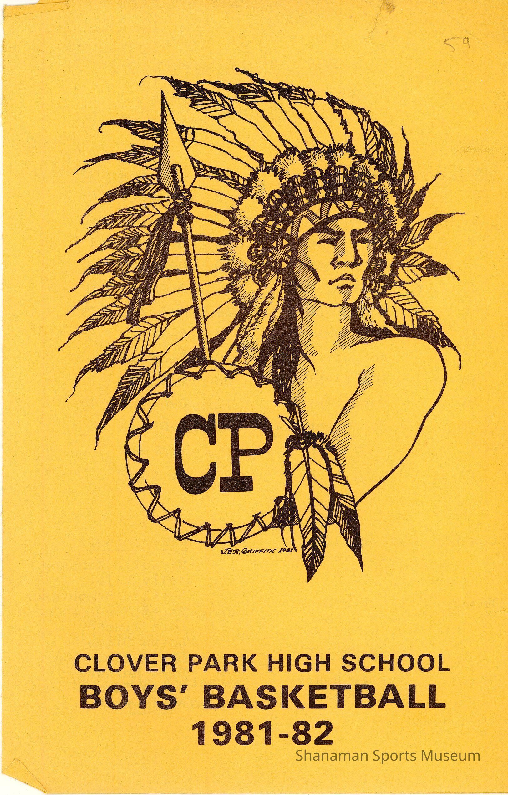 Program- Clover Park High School Boys' Basketball 1981-1982; inside features rosters for Bethel High School Boys' Basketball and Clover Park High School Boys' Basketball, Coahes, Managers, Stats., Athletic Directors, Principals, Cheerleaders for each school; back cover features roster for Clover Park High School Junior Varsity Boys' Basketball; program is orange with black lettering and features a graphic of the Clover Park Indians mascot / logoArchive Details