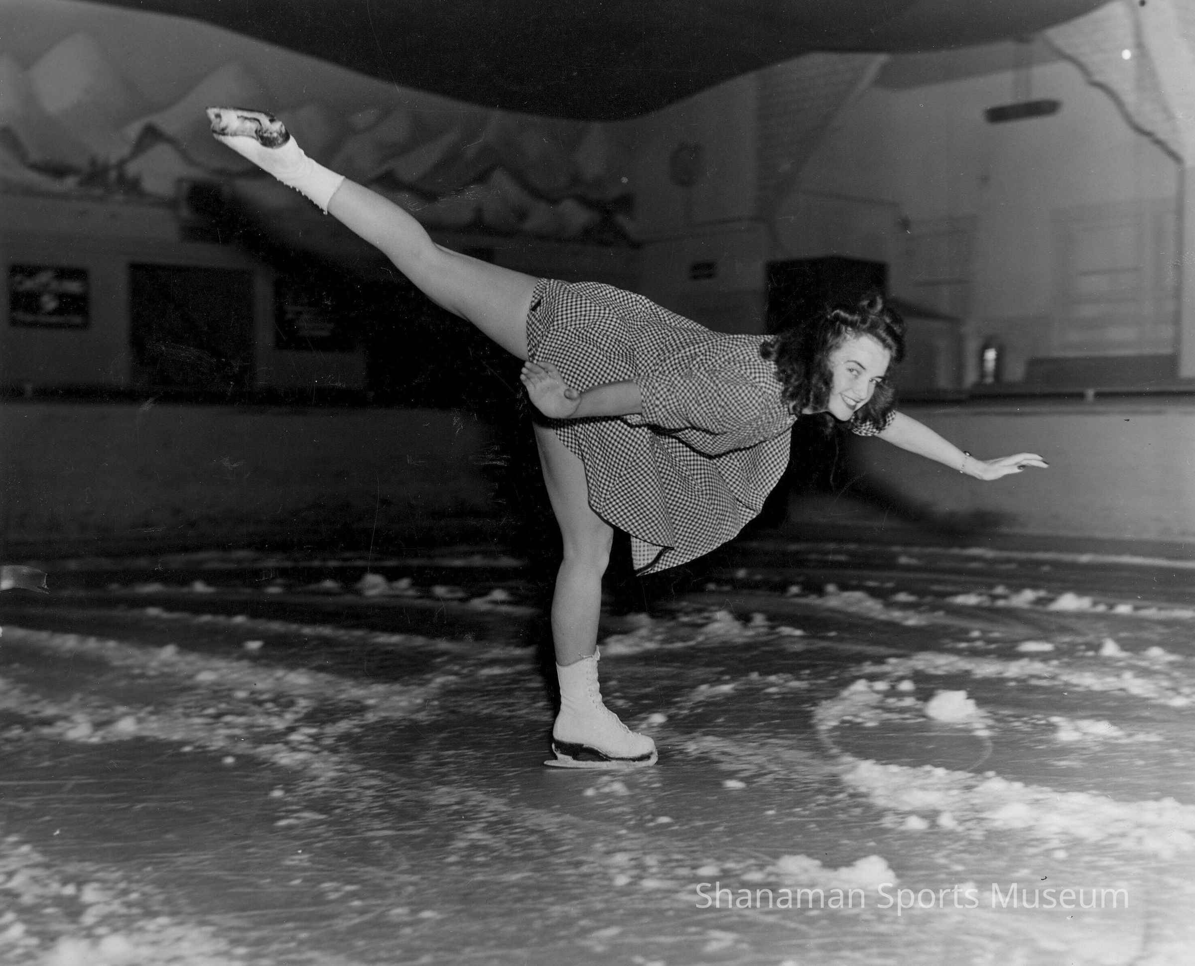 With her left leg extended behind her, Margaret Clarke skates across the ice at the Lakewood Ice Arena wearing a checkered skating costume. She skated professionally for many years, performing with the Ice Capers Show.Made/Created
