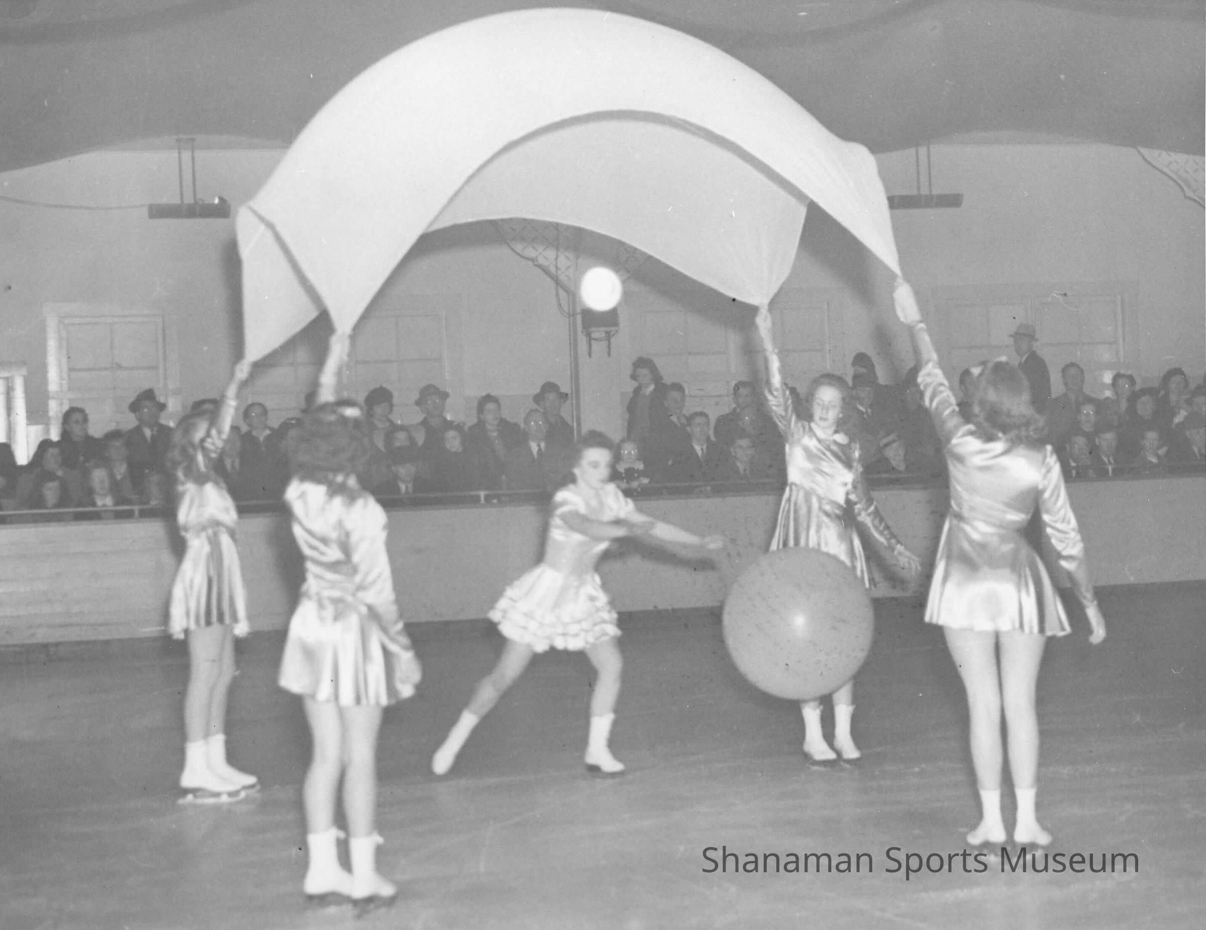 Unidentified skaters perform during an ice show at the Lakewood Ice Arena. The arena was home to many top level skaters when it opened in the 1930s. It was a popular hangout spot for families and couples, and teenagers. By 1955 the show had eight performances and 175 skaters. The rink hosted numerous shows and was the entertainment hub for Tacoma residents until 1982 when part of the building collapsed and the rest was demolished.Lexicon