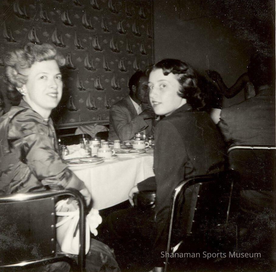 Two unidentified women enjoy a meal at the Lakewood Ice Arena. The arena was home to many top level skaters when it opened in the 1930s. It was a popular hangout spot for families and couples, and teenagers. By 1955 the show had eight performances and 175 skaters. The rink hosted numerous shows and was the entertainment hub for Tacoma residents until 1982 when part of the building collapsed and the rest was demolished.Made/Created