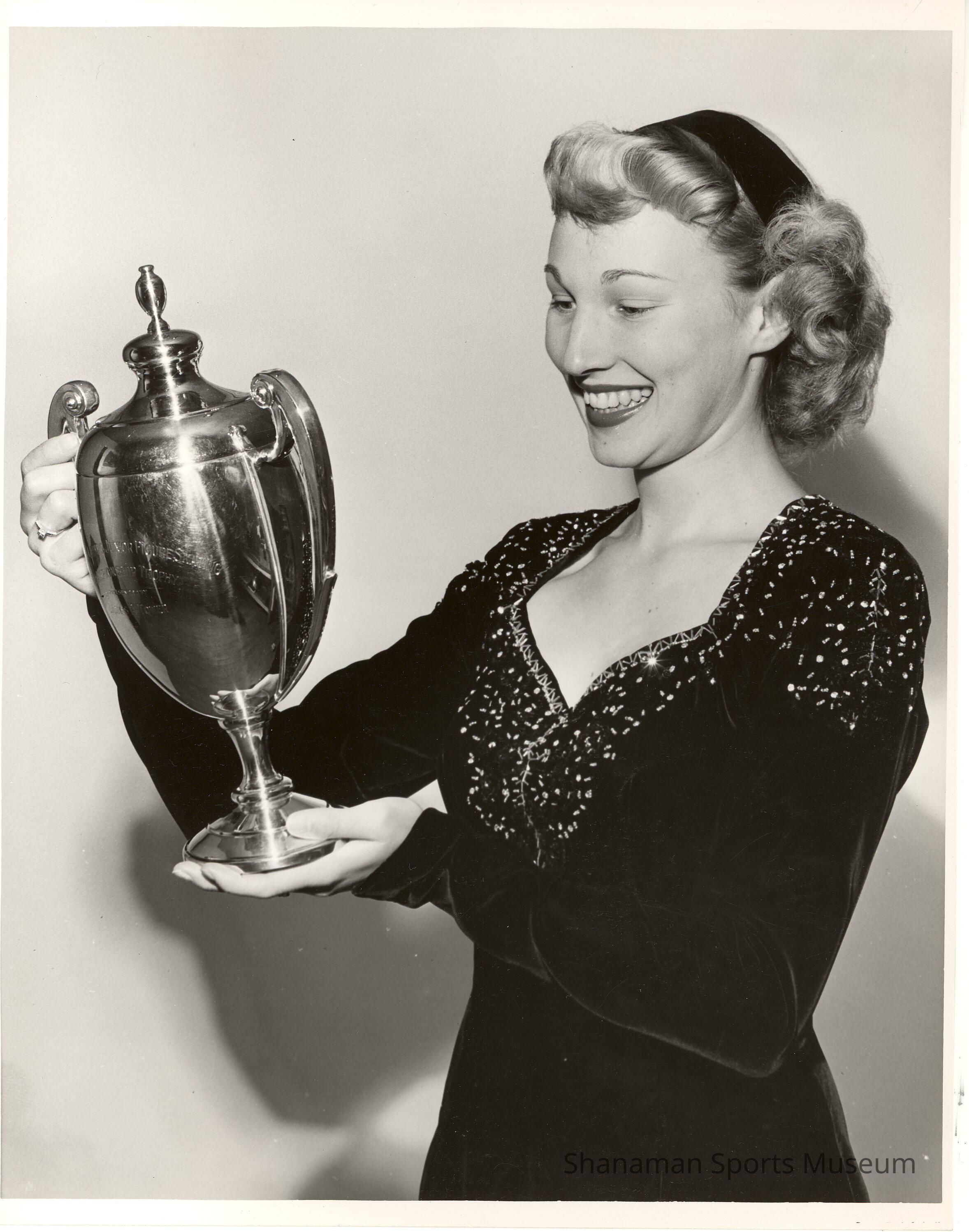 Seattle Skating Club figure skater, Pat Firth, is pictured with the 1953 trophy she won for winning the National Junior Ladies Championships in Hershey, Penn. Pat represented Lakewood in regional, national and world competition, winning her first championship in 1951, the Northwest Senior Ladies, and was third in Junior Ladies at nationals. Firth won the Pacific Coast Senior Ladies in 1952 and moved up a spot to second in Junior Ladies at nationals. She repeated as Pacific Coast champion in 1953 and then won the national Junior Ladies title, earning a spot on Team USA’s world team, placing seventh at the world championships in 1955 in Vienna, Austria. Firth was especially qualified at figures — which amounted to 60 percent of the overall score. She went on to earn her United States and Canadian Golf Test medals in figures and freestyle. Firth also earned a master’s rating as a skating teacher and coach. She was inducted into the Tacoma Sports Hall of Fame in 2005. Photo credit Fred Carter, Seattle.Lexicon