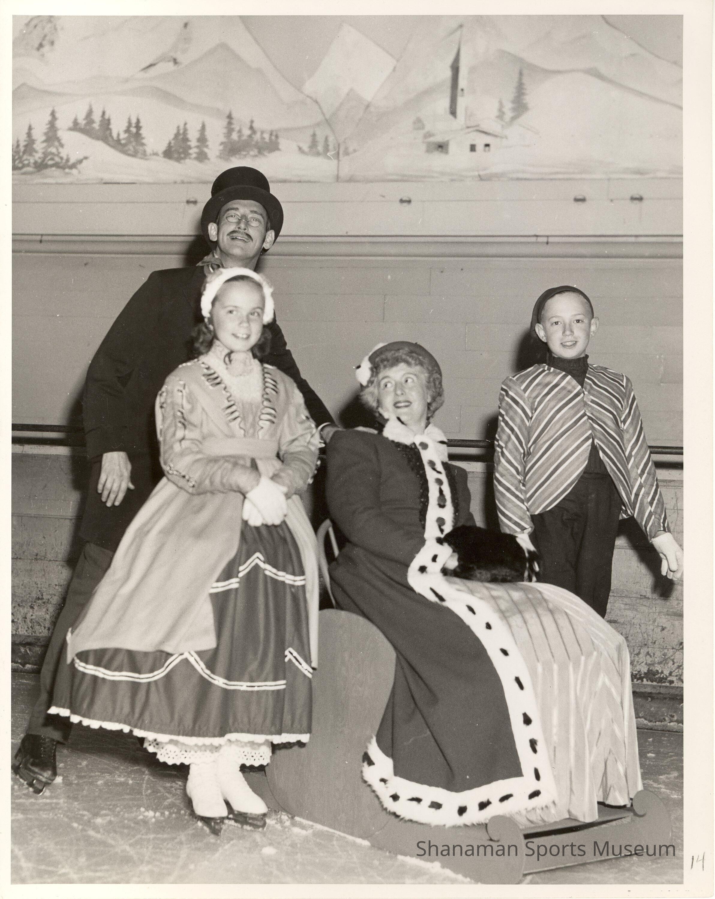 Lakewood Ice Arena hosted the annual Ice Capers show to great accolades for many years. Pictured are Jerry Hurley, Heidi Jensen, Ruth Babbit (seated), and Eddie Brasco performing in the Currier & Ives performance. By 1955 the show had eight performances and 175 skaters. The rink hosted numerous shows and was the entertainment hub for Tacoma residents until 1982 when part of the building collapsed and the rest was demolished.