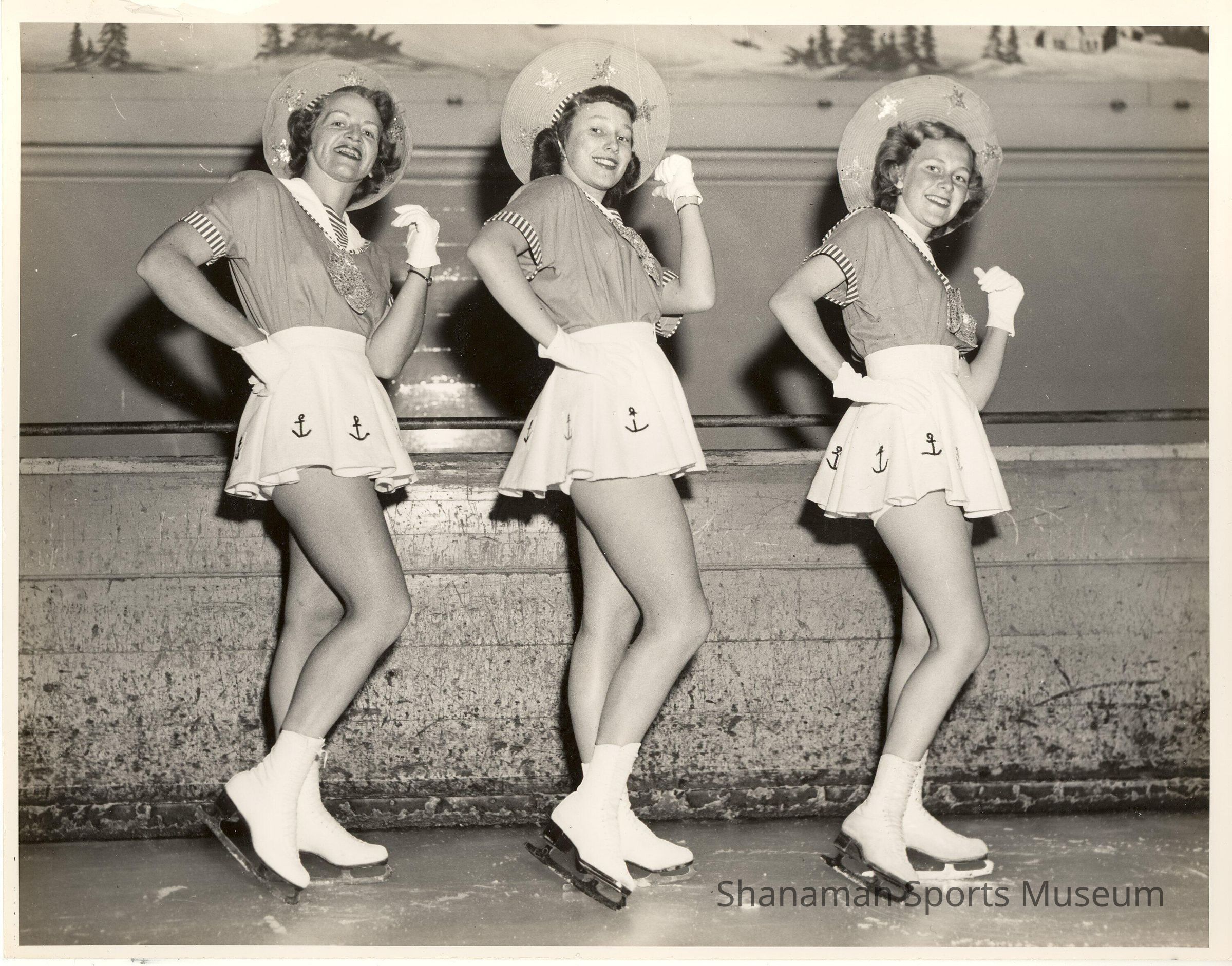 Dressed in shite skirts with anchors decorated on them, these three women performed the “Sailors Hornpipe” in the 1950 Ice Capers at the Lakewood Ice Arena. The three skating performers were Dora Mae Coy, Pat Firth and Nancy Roberts and they were all wearing matching outfits.Made/Created