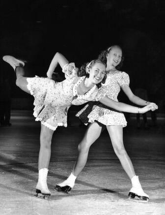 Seattle Skating Club figure skaters, Mary Firth and Pat Firth, ages 17 and 10, skate together in flowered costumes circa 1945 or 1946. Pat represented Lakewood in regional, national and world competition, winning her first championship in 1951, the Northwest Senior Ladies, and was third in Junior Ladies at nationals. Firth won the Pacific Coast Senior Ladies in 1952 and moved up a spot to second in Junior Ladies at nationals. She repeated as Pacific Coast champion in 1953 and then won the national Junior Ladies title, earning a spot on Team USA’s world team, placing seventh at the world championships in 1955 in Vienna, Austria. Firth was especially qualified at figures — which amounted to 60 percent of the overall score. She went on to earn her United States and Canadian Golf Test medals in figures and freestyle. Firth also earned a master’s rating as a skating teacher and coach. She was inducted into the Tacoma Sports Hall of Fame in 2005.Lexicon