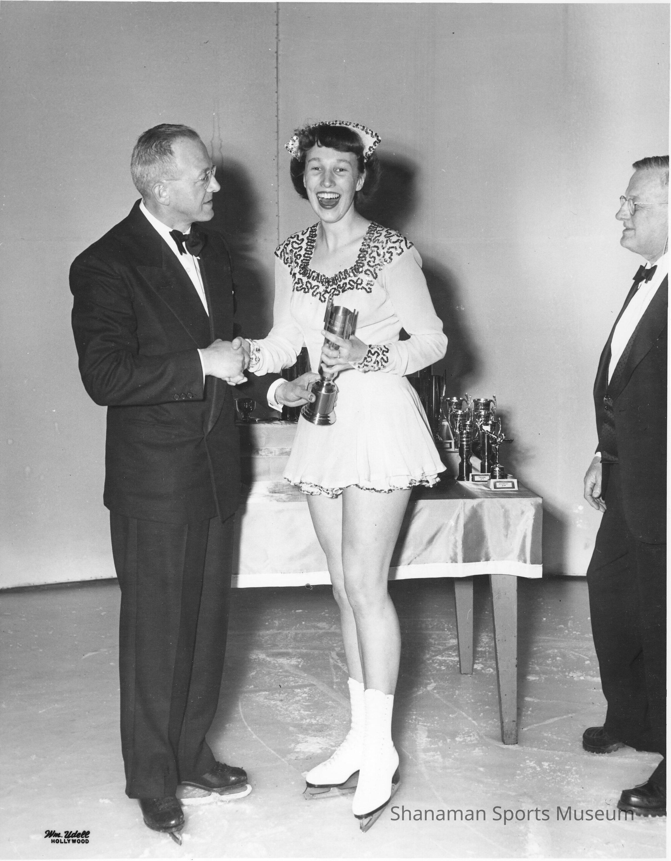 Pat Firth receives her award trophy for winning the Senior Ladies title at the 1952 Pacific Coast Championships. Pat represented Lakewood in regional, national and world competition, winning her first championship in 1951, the Northwest Senior Ladies, and was third in Junior Ladies at nationals. Firth won the Pacific Coast Senior Ladies in 1952 and moved up a spot to second in Junior Ladies at nationals. She repeated as Pacific Coast champion in 1953 and then won the national Junior Ladies title, earning a spot on Team USA’s world team, placing seventh at the world championships in 1955 in Vienna, Austria. Firth was especially qualified at figures — which amounted to 60 percent of the overall score. She went on to earn her United States and Canadian Golf Test medals in figures and freestyle. Firth also earned a master’s rating as a skating teacher and coach. She was inducted into the Tacoma Sports Hall of Fame in 2005.