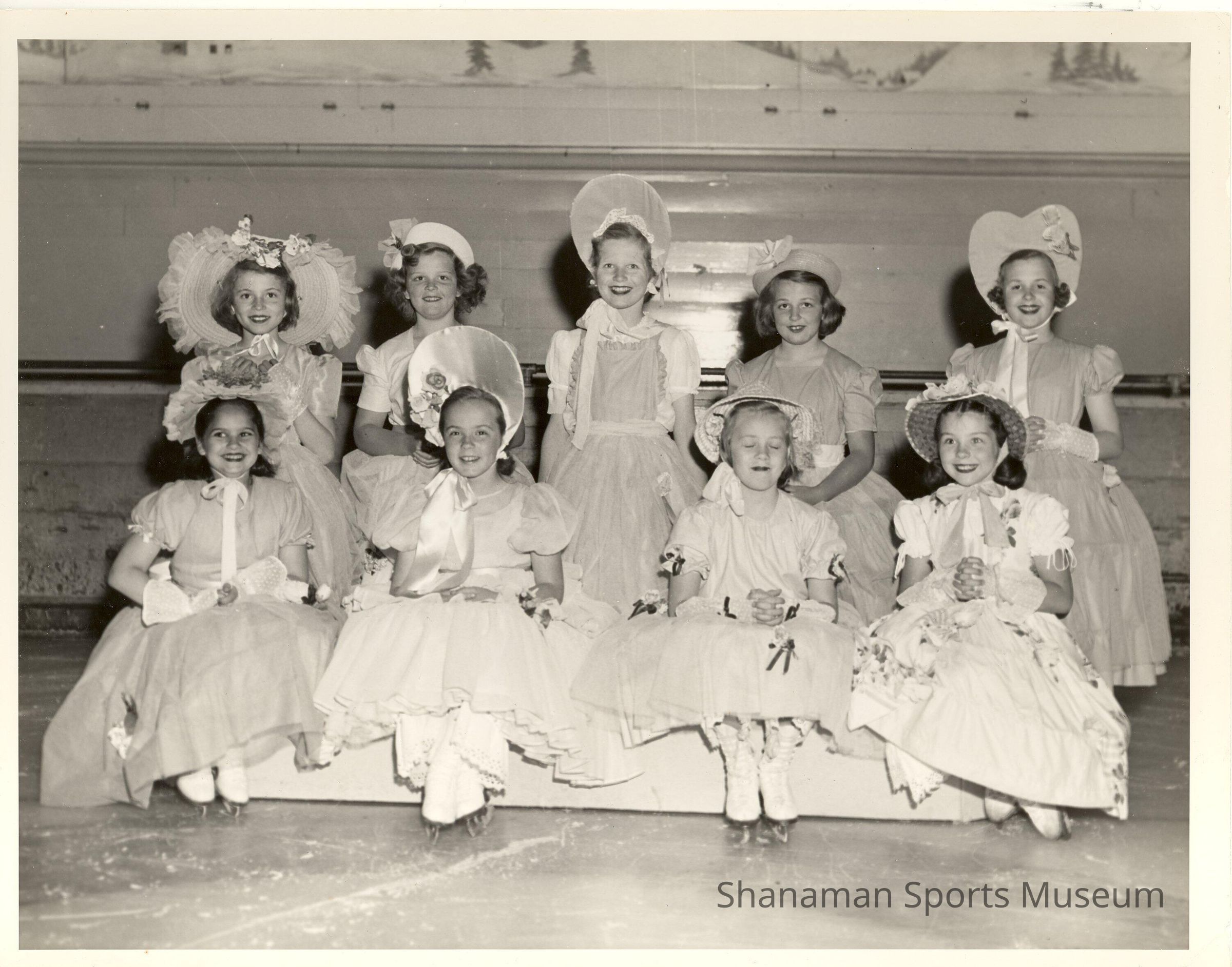 Young skaters, including Heidi Jensen (front row, second from left), are dressed in bonnets and frilly dresses, and were performers in the annual Ice Capers show at the Lakewood Ice Arena. The arena was home to many top level skaters when it opened in the 1930s. It was a popular hangout spot for families and couples, and teenagers. By 1955 the show had eight performances and 175 skaters. The rink hosted numerous shows and was the entertainment hub for Tacoma residents until 1982 when part of the building collapsed and the rest was demolished.Made/Created