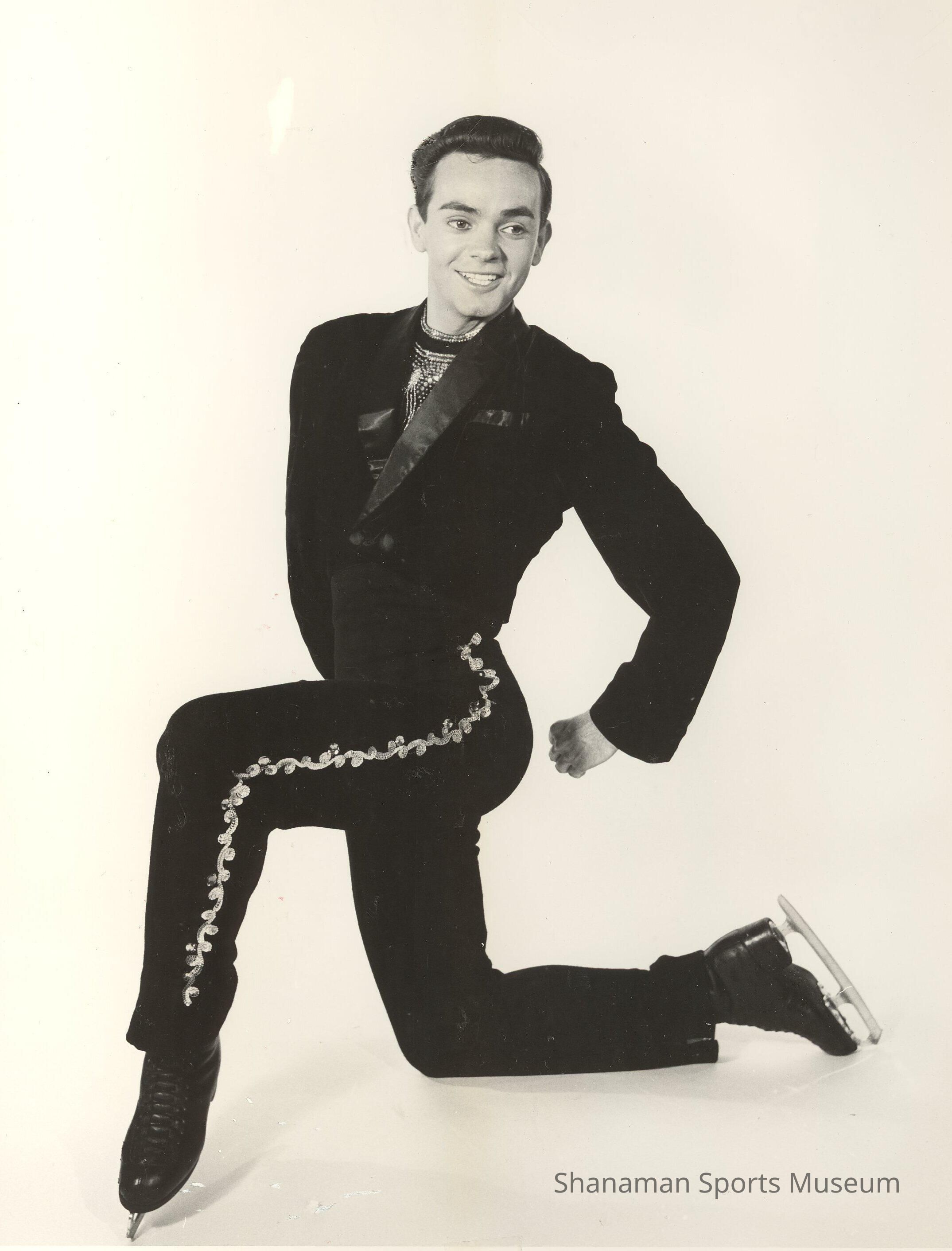 Smiling for the photo, Jack Boyle poises for the black-and-white picture wearing black skates and a dark costume with sequined trim on his pant legs. For many years, Boyle entertained crowds by performing with the Ice Capers Show in the 1940s and '50s.