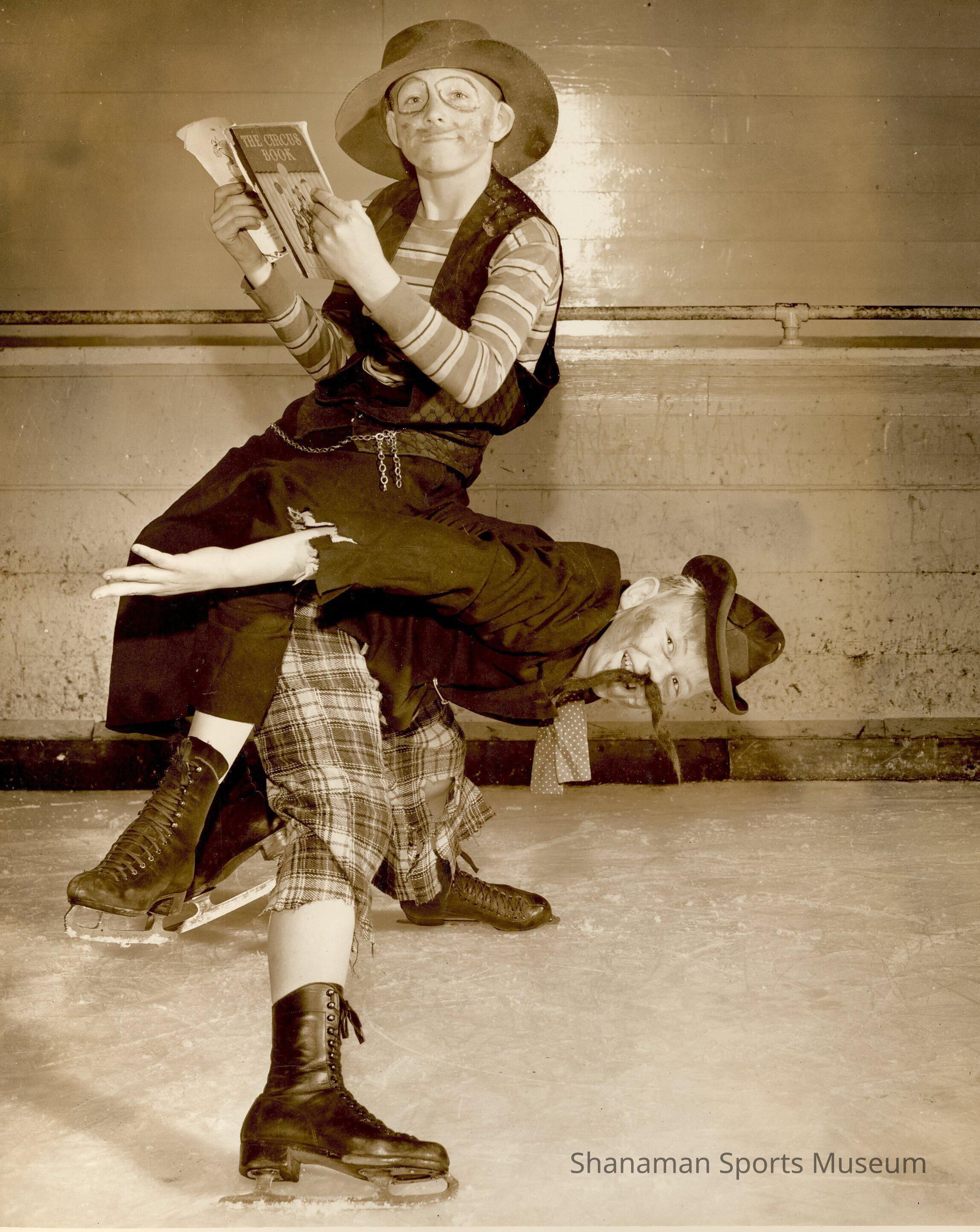 As a young child David Riggs skated at the Lakewood Ice Arena and was involved in the Lakewood Figure Skating Club, later renamed to the Lakewood Winter Club. Riggs was half of the comedy team of Hamm & Riggs, with partner Larry Hamm, that performed at the ice arena during its heyday. The arena itself hosted numerous ice shows to great accolades and had as many as 175 skaters performing in eight shows by the mid 1950s. A young David Riggs sitting on the back of bent over Larry Hamm, practice for an Ice Capers show wearing hobo costumes and reading a circus book.Made/Created