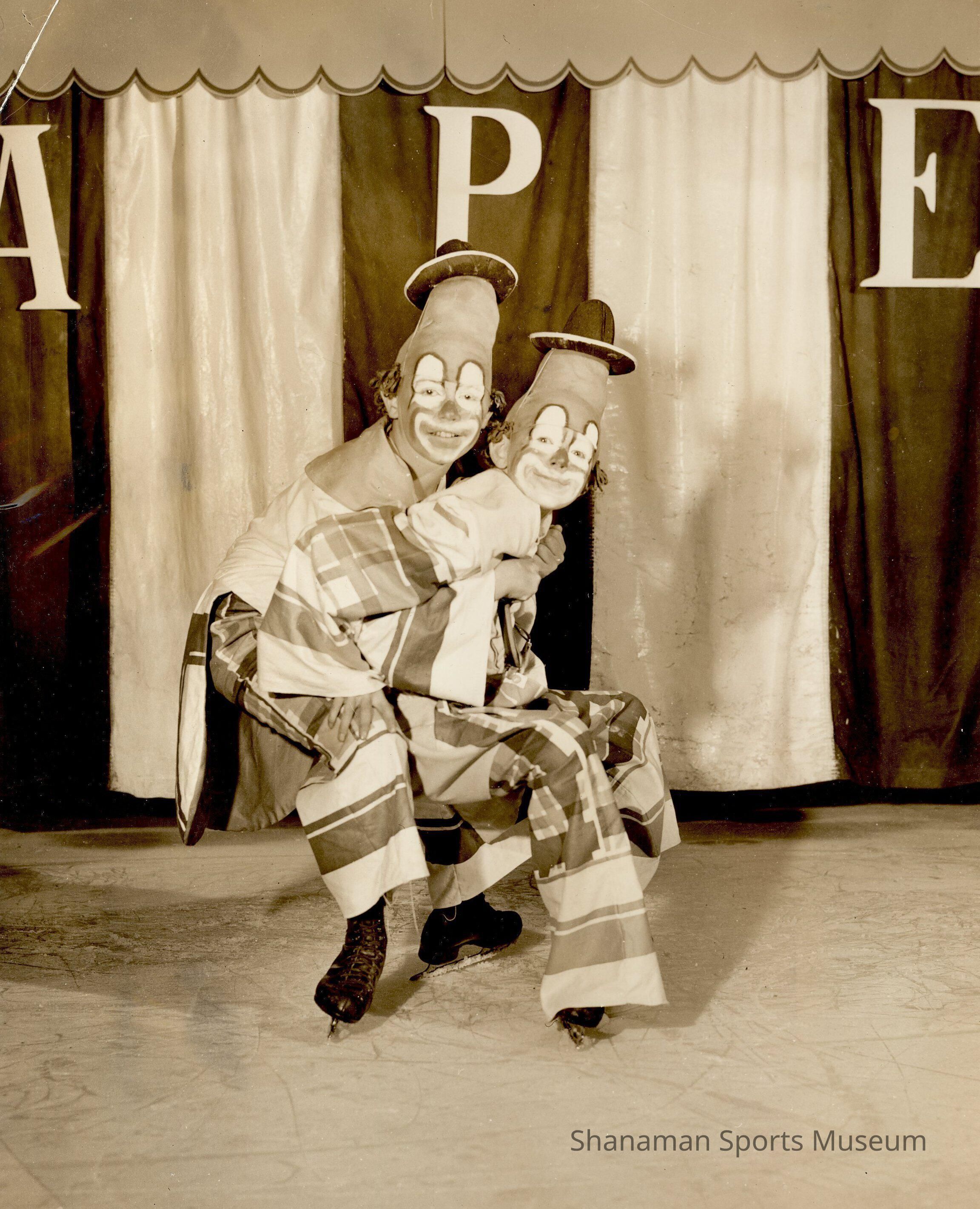 As a young child David Riggs skated at the Lakewood Ice Arena and was involved in the Lakewood Figure Skating Club, later renamed to the Lakewood Ice Arena. Riggs was half of the comedy team of Hamm & Riggs, with partner Larry Hamm, that performed at the ice arena during its heyday. The arena itself hosted numerous ice shows to great accolades and had as many as 175 skaters performing in eight shows by the mid 1950s. A young Larry Hamm and David Riggs practice in clown costumes with pointed heads for an Ice Capers show.Made/Created